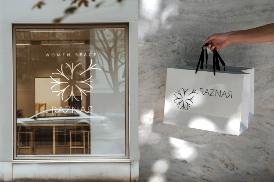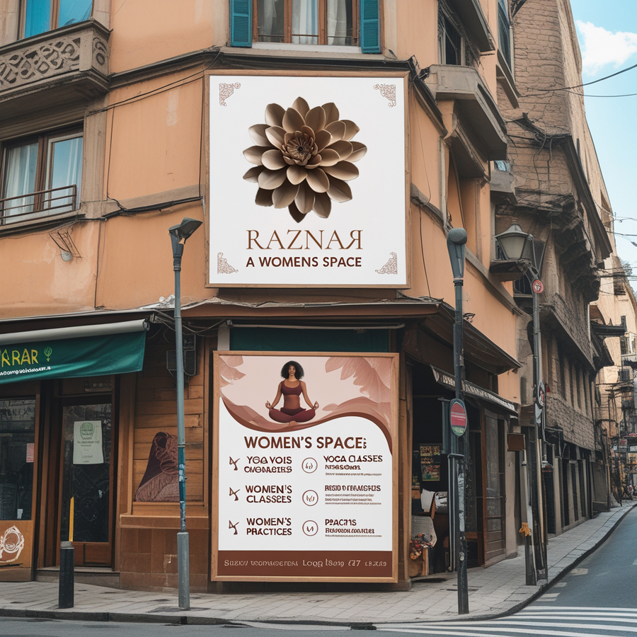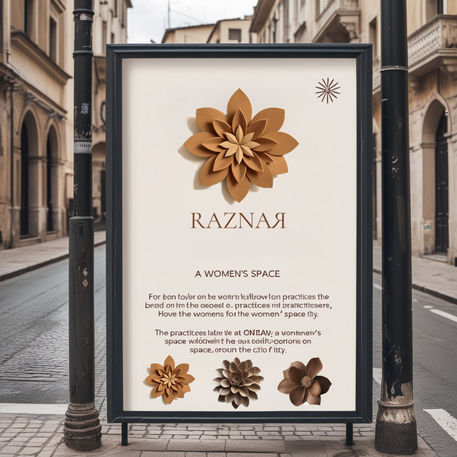 Промт 1: create posters on the central street of the city for the brand «RAZNАЯ», a women’s space, above the name there is a flower logo in brown tones, a poster in a minimalist style, advertises the practices taking place in the space