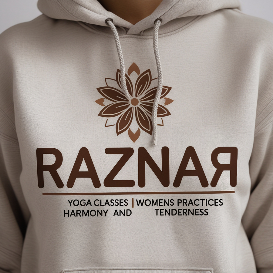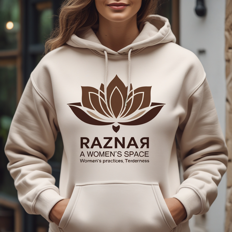 Промт 4: we create a hoodie for the brand «RAZNАЯ», a women’s space, above the name there is a flower logo in brown tones, advertising the yoga classes taking place in the space, women’s practices, harmony and tenderness