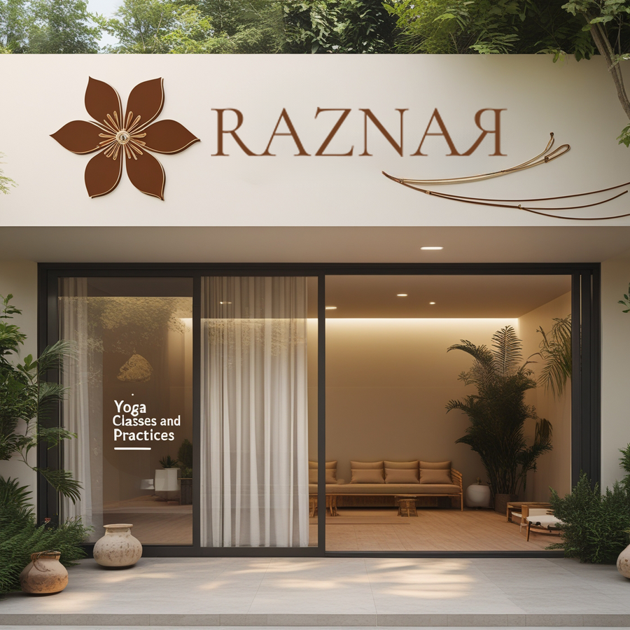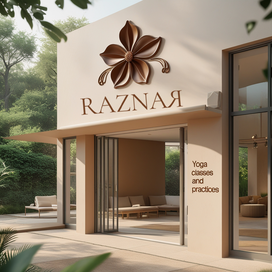 Промт 1: create a building outside for the brand «RAZNАЯ», a women’s space, above the name there is a flower logo in brown tones, advertising yoga classes and practices taking place in the space