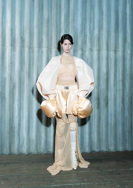 В детстве папа учил меня защищаться, драться и уважать партнера по бою, это повлияло на меня как на личность. В проекте я опираюсь на работу «ее мягкая рука» художницы Зои Бакман, которая исследует неоднозначность характеристик, предписанных женщинам и раскрывает связь между браком и боксерским поединком. За основу я взяла образы боксера и невесты. Совмещая элементы боксерской экипировки и свадебных атрибутов я ставлю в центр проекта проблематику взаимоотношений и сотрудничества между людьми как на боксерском ринге, так и в семейной жизни. Также важной проблемой проекта стала противоречивость традиционного восприятия характеристик женщины.