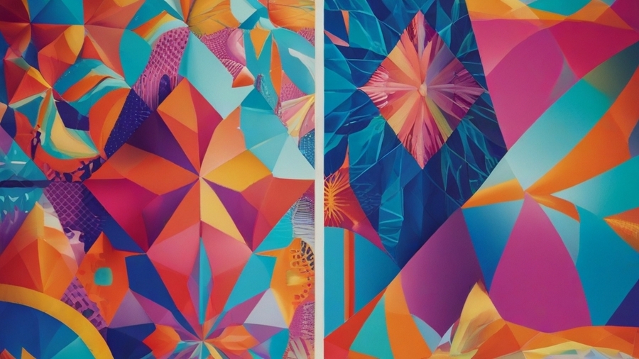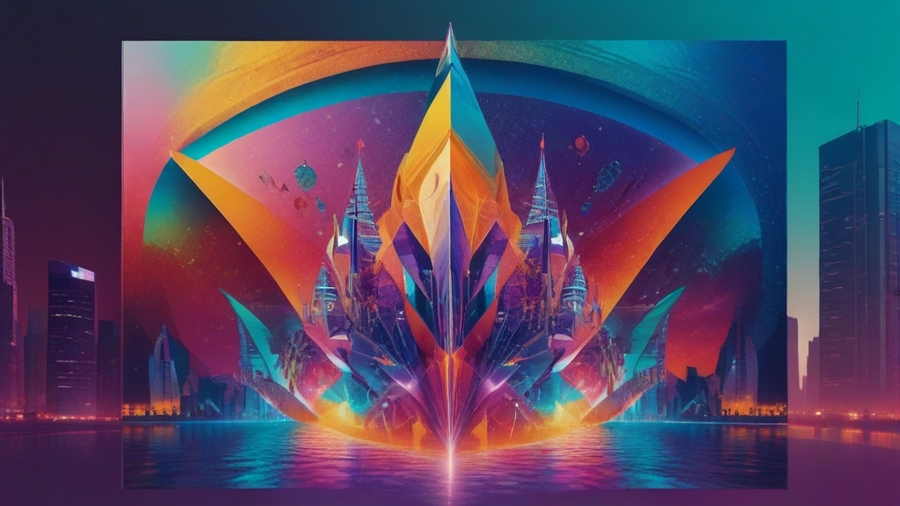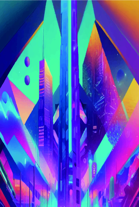 promt: Immerse yourself in a kaleidoscope of color and innovation as you explore our futuristic city, adorned with dynamic shapes and illuminated by neon lights. Let your imagination run wild as you discover our unique merchandise through the lens of our mesmerizing kaleidoscope promotional posters.
