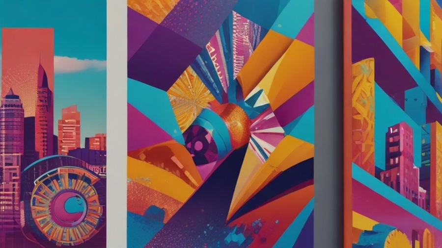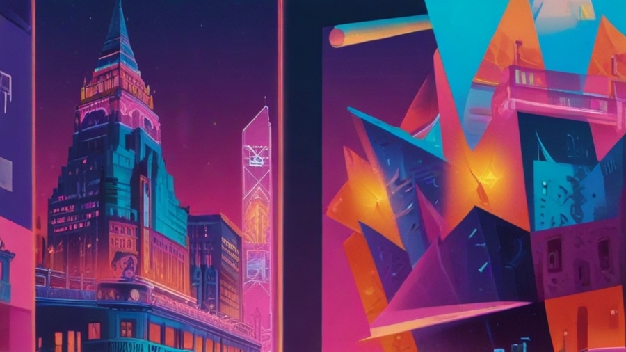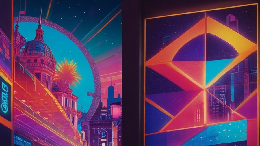 promt: Explore the city like never before with our promotional posters in rich colors and dynamic shapes with a kaleidoscope on them. Let the neon lights tell you about our innovative souvenir products.