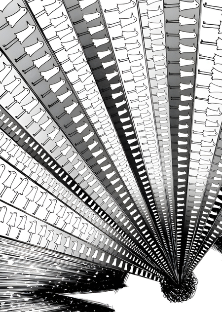 На этой стадии повествования визуальный образ Пунпуна претерпевает наиболее резкий и тревожный сдвиг: он перестаёт быть хоть сколько-нибудь стабильным или узнаваемым. Асано буквально размывает или уничтожает границы его формы — Пунпун всё чаще появляется в виде чёрной, бесформенной массы, угнетённой сгорбленной фигуры, а иногда он и вовсе исчезает с панелей, оставляя пустое пространство на месте своего присутствия. Эти приёмы нельзя рассматривать просто как стилистические ходы: они становятся частью визуального языка психологического краха.