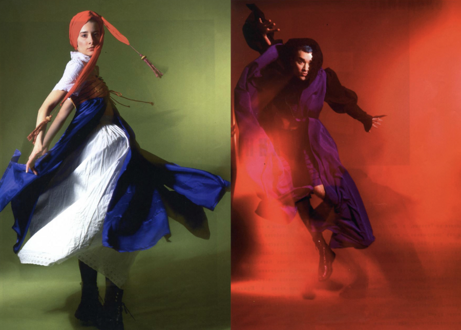 «Мания величия» Коллекция Владимира Бухинника съемка для журнала «Матадор», 1995 фото: Владимир Фридкес модели: Лена Барчукова, Владимир Бухинник, Владимир Калинчев