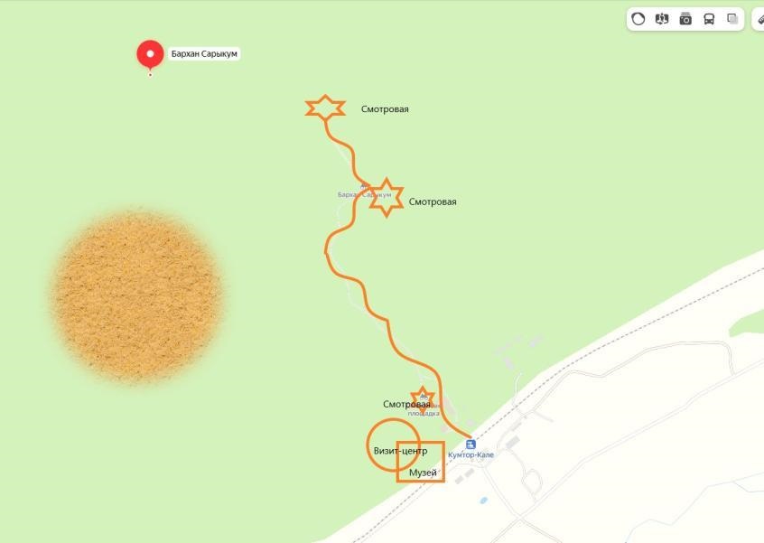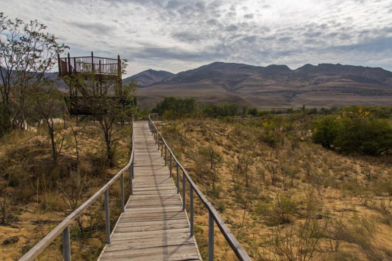 Инфраструктура экологической тропы Дагестанского заповедника (экспозиционный маршрут результатов исследования) состоит из следующих объектов: 1. Визит-центр 2. Музей 3. Соколиный питомник 4. Маршрут по бархану (деревянный настил) 5. Смотровые вышки и площадки