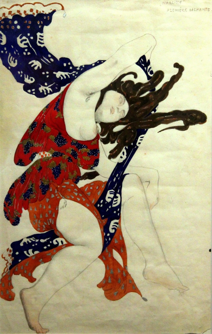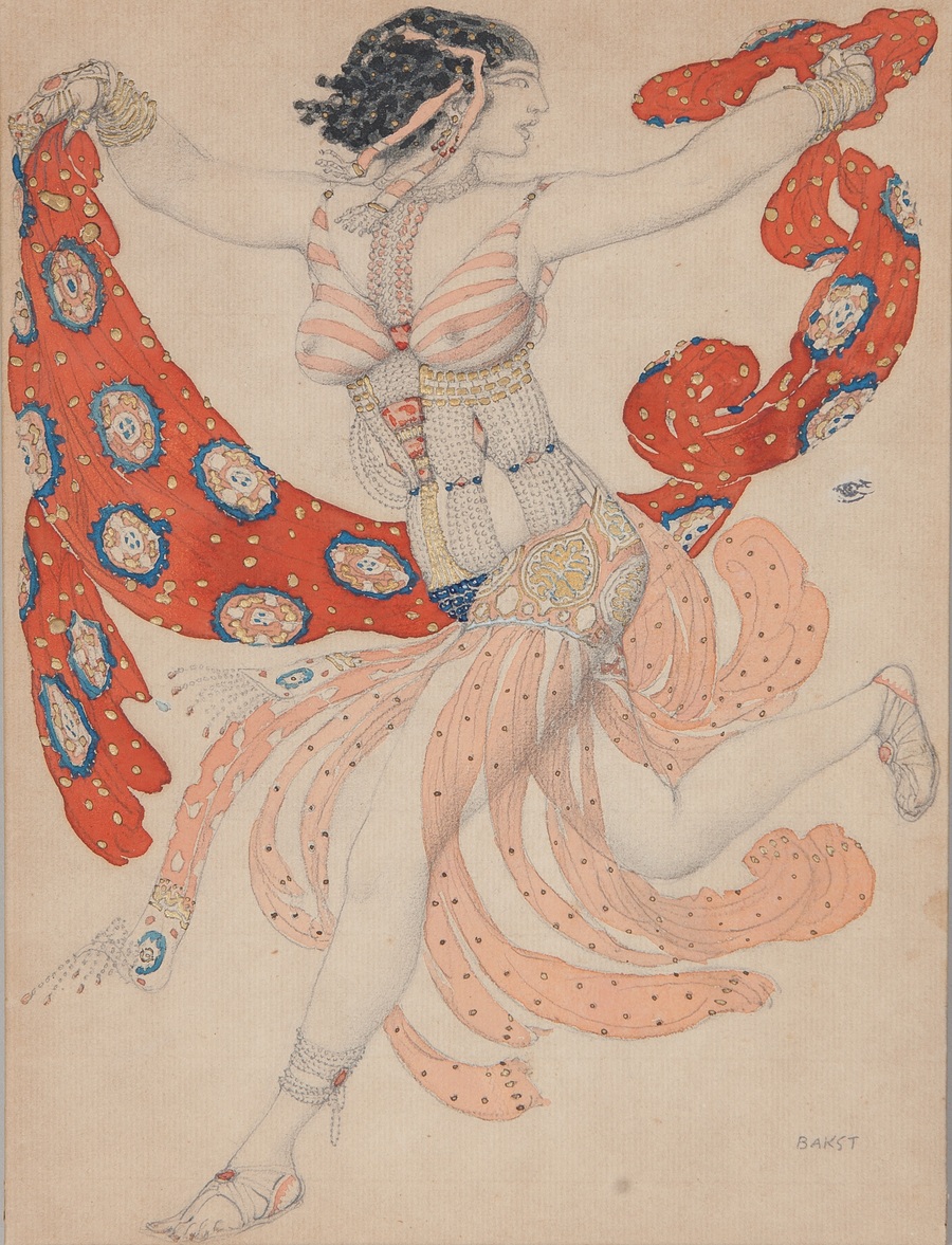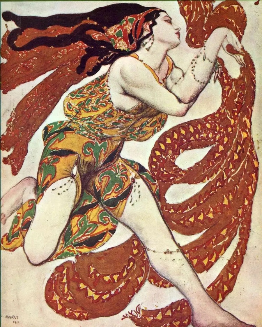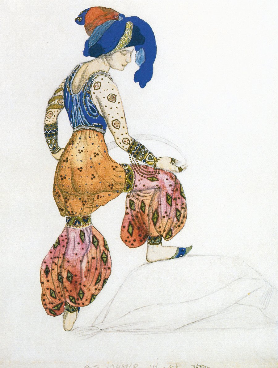 Цветовая гамма максимально приближенна свойственной работам Бакста. В одежде множество сложносочинённых орнаментов, а также, соблюдена важная стилеобразующая особенность эскизов Леона Бакста — цветастые развивающиеся полотна, задающие динамику и уравновешивающие композицию. Позы, изброженных персонажей, плавные и динамичные.