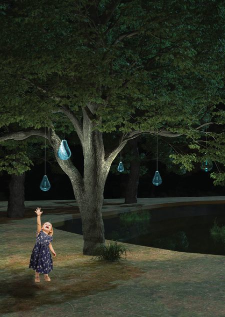Таким образом и родилась идея моей световой инсталляции. Она представляет собой стеклянные капли, висящие на ветках. Эта композиция символизирует слёзы деревьев и передаёт ощущение грусти и страха. Капля подсвечивается изнутри с помощью светодиодного модуля. В качестве материалов используются цветное узорчатое стекло и колотый лёд.