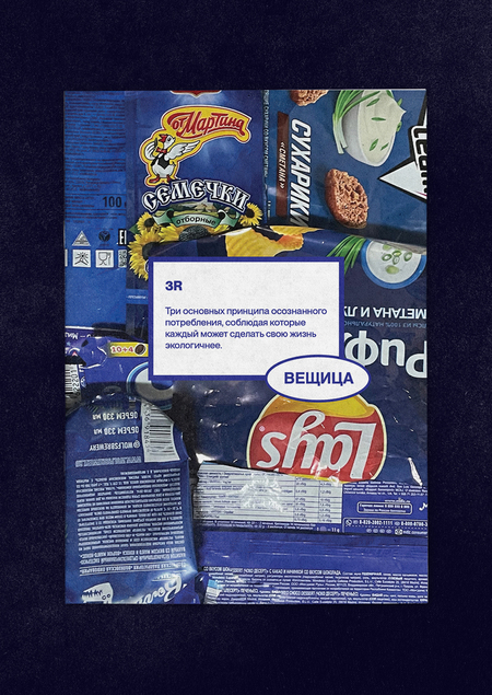 Буклет рассказывает о трёх основных принципах экологии (reduce, reuse, recycle) и о том, как они реализуются в арт-пространстве: - Кафе позволяет сократить отходы - Музей и секонд-хенд переиспользуют старые вещи - Мебель сделана из переработанных материалов