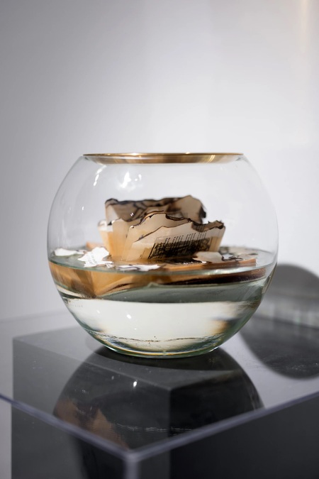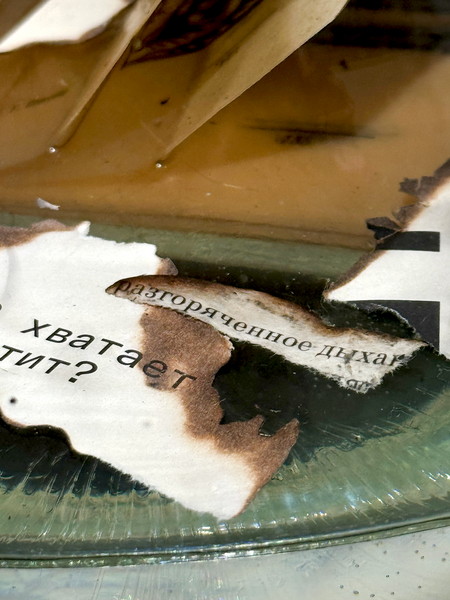 Время невозвратно. Любая фиксация своей жизни обречена на провал. Книга запечатанная в стекле символизирует безуспешную попытку сохранить что-то в вечности. Рукопись — это консервация информации, но и она разрушится под воздействием времени. Все движется к распаду и утрата неизбежна. Чем пахнет утрата? Потеря хрупких частиц дорогих или важных воспоминаний, посланий, личных историй? Гарью, костром и пеплом. Сожжение-символ смерти, кремации. Сгорая, объект расщепляется до пыли и атомов, возвращаясь к исходному облику-праху. Объект и запечатанный в нем запах пепла предлагает подумать о попытках сохранять самое ценное в самой хрупкой и ненадежной форме.
