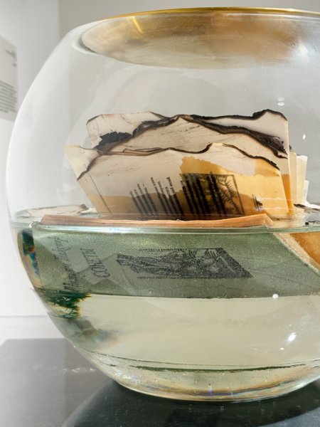 Объект демонстрирует время в двух измерениях. Нижняя часть книги еще цела. Она запечатана внутри стекла. Но верхняя часть уже подверженна распаду и исчезновению. Ее станицы обоженны, часть из них превращены в пыль и больше нет возможности их собрать. Это контрастное столкновение целостного и уничтоженного. В точке возникает граница явлений энтропии и консервации.
