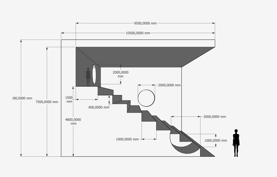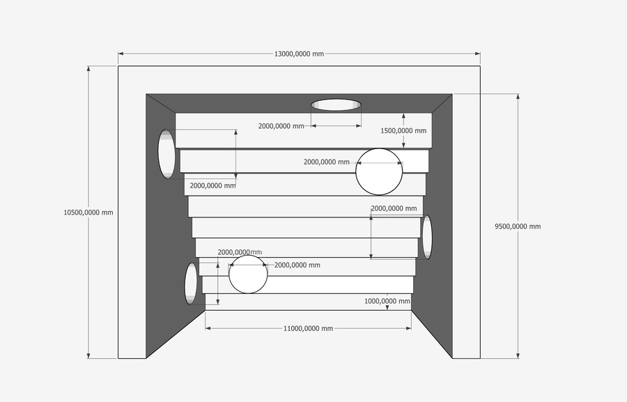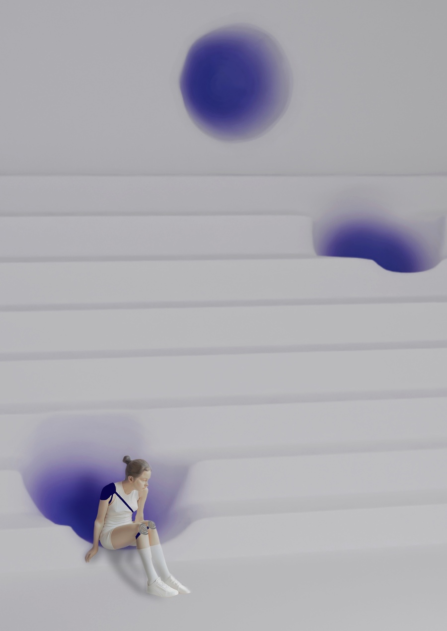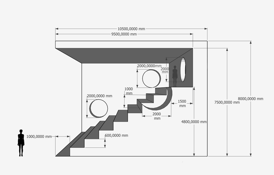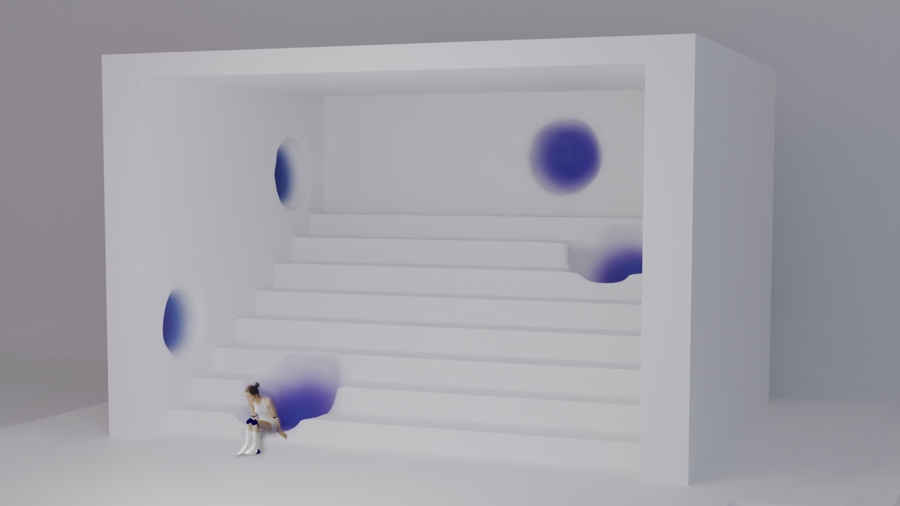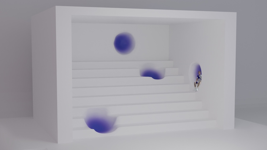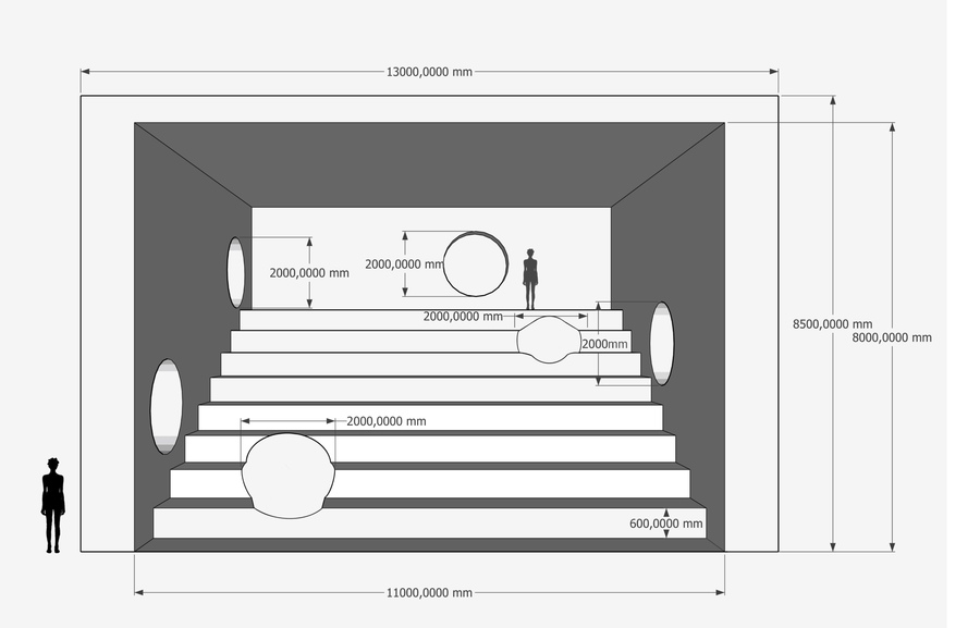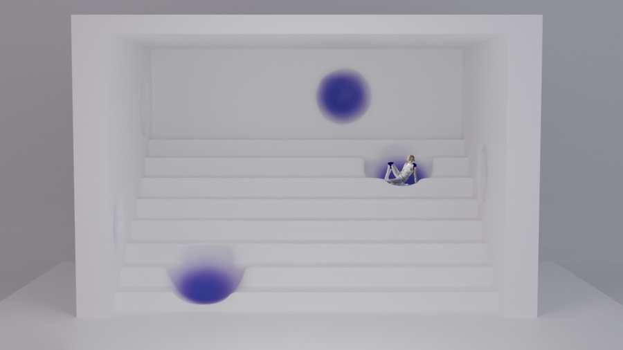 Белое многоуровневое пространство с отверстиями в стенах и полу. Оно напоминает пространство внутри себя чистое, восприимчивое, но подверженное изменениям.