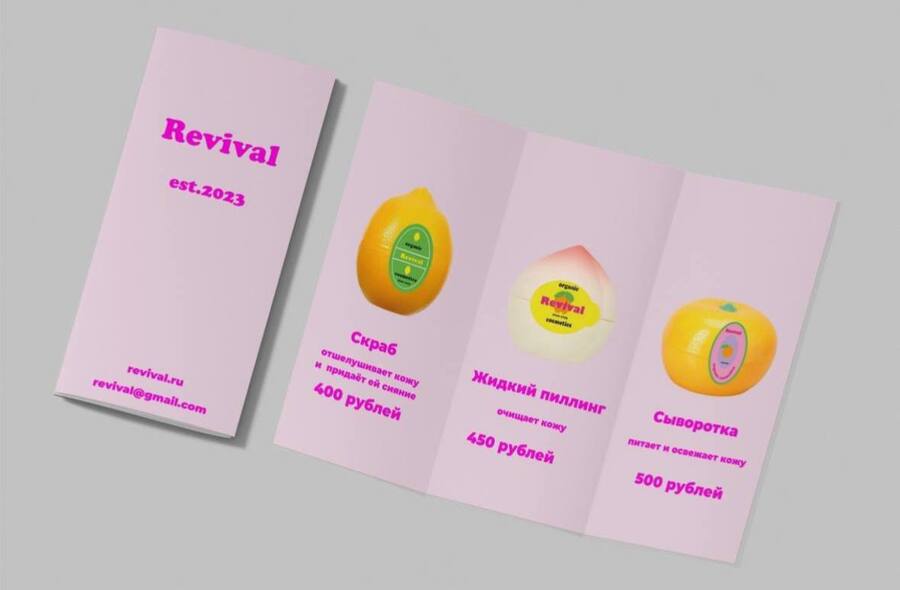 В прошлом году я создавала фирменный стиль для бренда органической косметики «Revival». Магазин «Revival» представляет собой линию уходовой косметики для подростков, которая состоит из кремов, сывороток и масок для борьбы с неровностями. Благодаря моей продукции девушки становятся уверенными в себе из-за улучшения состояния кожи.
