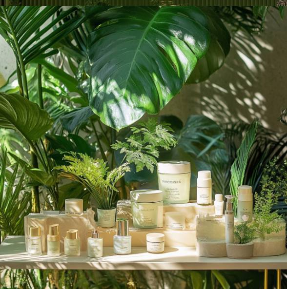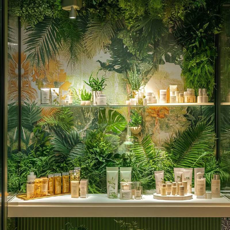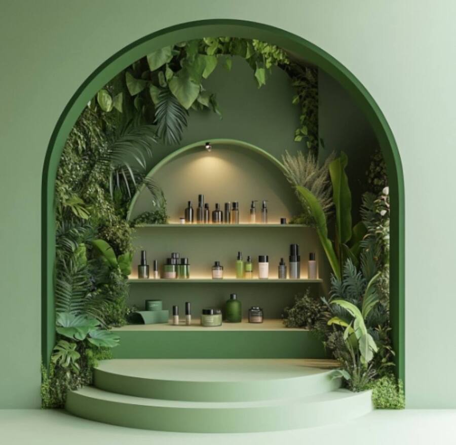 Поп-ап для продажи косметики зелёного цвета и с растениями https://www.midjourney.com/