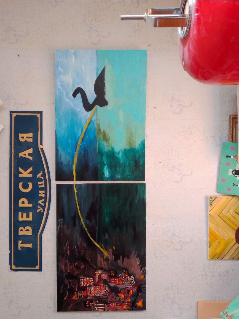 Отсутствие названия ввергает наблюдателя в сомнений хаос. Несси ли выглядывает из воды? Кот? Может быть слон? Тушит ли он этой мутной струëй пожар города, или, подливая масло, пытается лучше растопить. Диптих 100×70 (каждая) холст, масло.