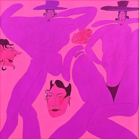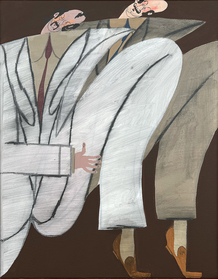 Нейросеть достаточно точно передала стиль Кевина Сабо: получившиеся персонажи с искаженными пропорциями и миниатюрными головами будто «вдавлены» в холст. Яркие, почти неоновые цвета контрастируют с лаконичным однотонным фоном, а отсутствие перспективы подчеркивает плоскостность и гротескную динамику.