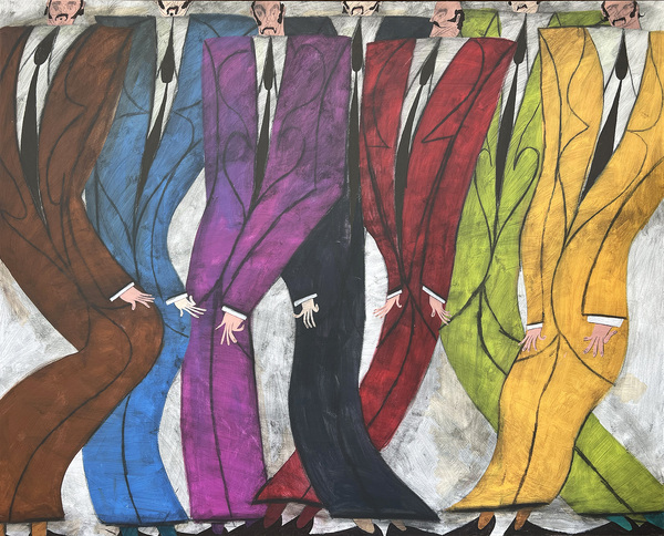 photo collage in kevin sabo style, a painting of men in stripe suits