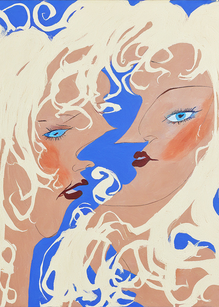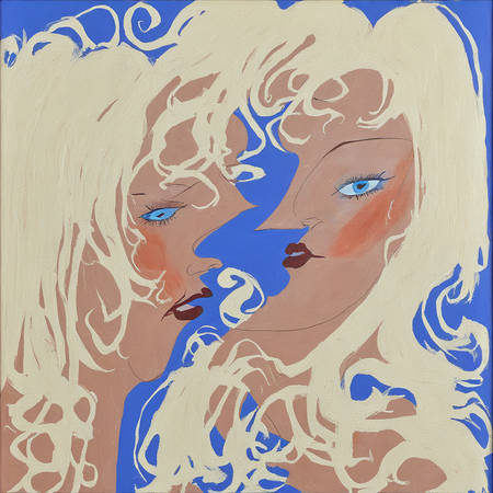 Слева: photo photo collage in kevin sabo style, a painting of a woman with blue lips; Справа: photo collage in kevin sabo style, a painting of a woman with big blonde hair and blue eyes