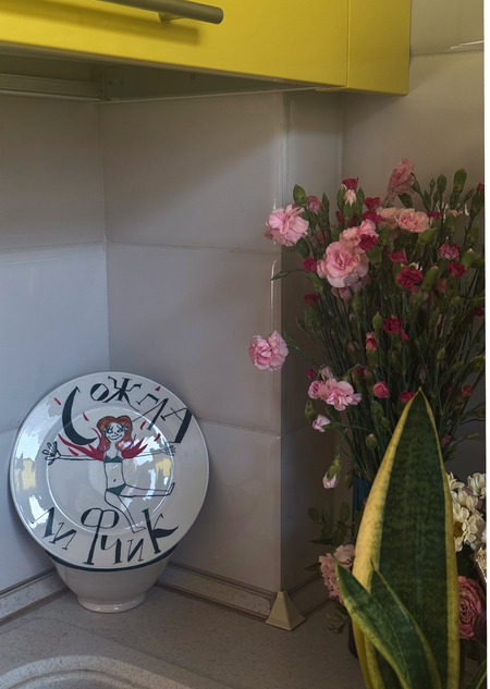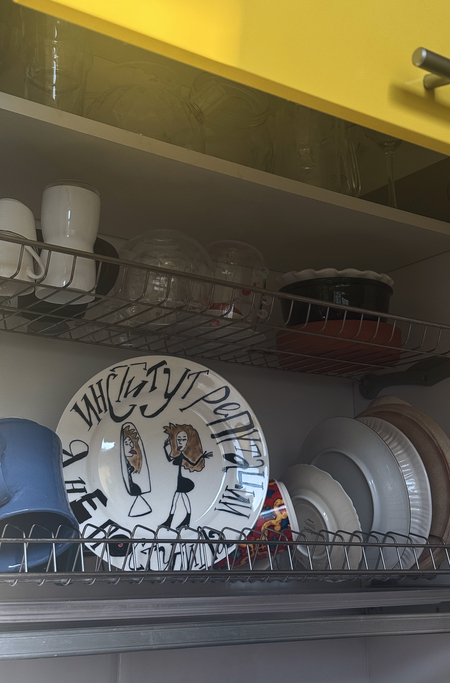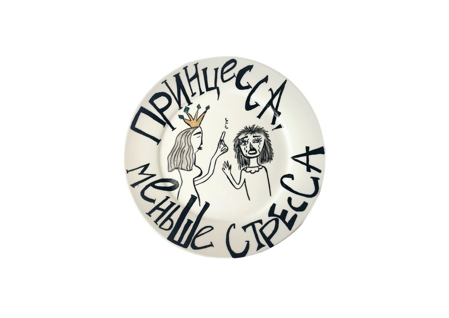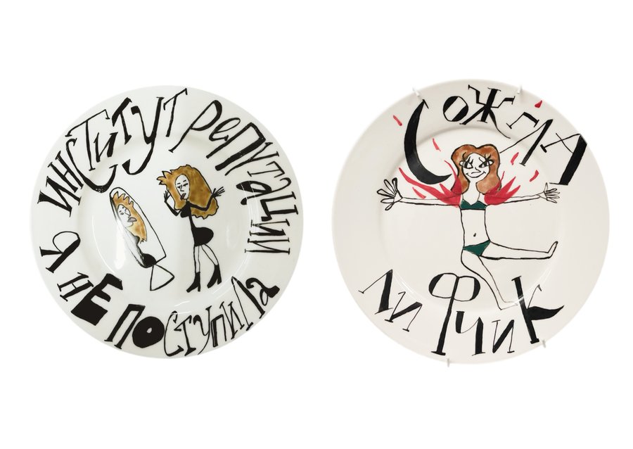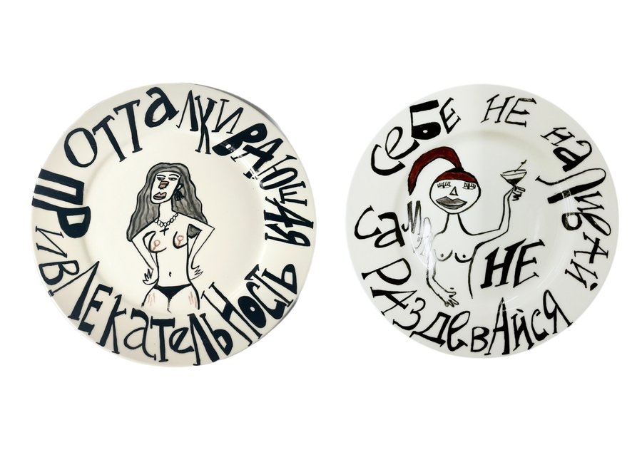 Тарелки отсылают к стилю агитационного фарфора, однако они не агитируют. Это своеобразный путь трансляции женского современного мировоззрения. Они слишком игривы, чтобы восприниматься всерьез, но достаточно правдивы, чтобы им не верить.