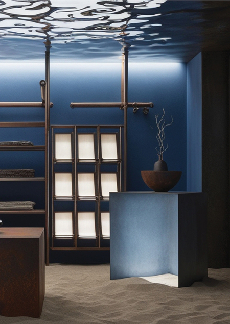 Room with blue walls and rusted steel table, voluminous underwater lighting, retaildesignblog, obsidian accents, inspired by Theodore Philipsen, floating in a powerful state of zen, merchant racks, well rendered, simple ceiling, sand floor texture, ceiling made entirely of decorative steel that resembles water, no people in the picture, don’t put any objects on the racks