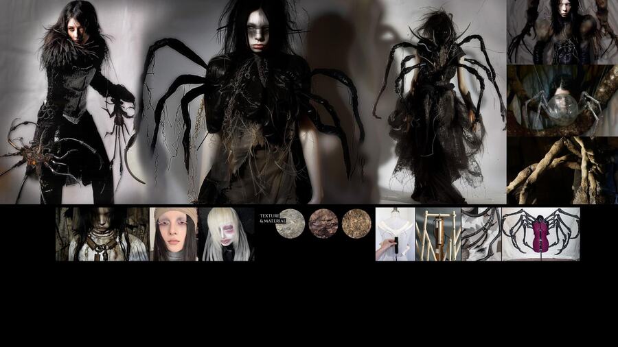 Паук-птицеед — представитель Среднего мира. Пауки по поверьям финно-угров плели паутину, соединяющую Верхний и Нижний мир, в моем мире Паучиха, съев птицу, захватывает большое птичье гнездо, и сама основывается в нем как сорока среди блестящих украшений и сухих веток. В моей Вселенной Паук не плетет паутину, но бесконечно лепит браслеты — причем из своих же ногтей, спрятанных в нычке заброшенного ржавого металлического постиндустриального мира. Она размалывает ногти в однородную массу и вылепливает свое новое украшение, и так по кругу…