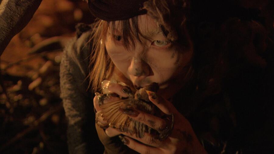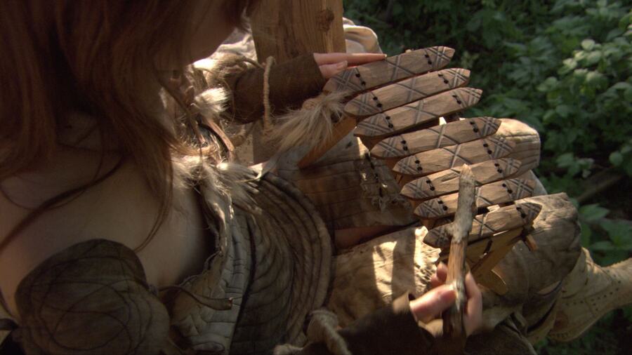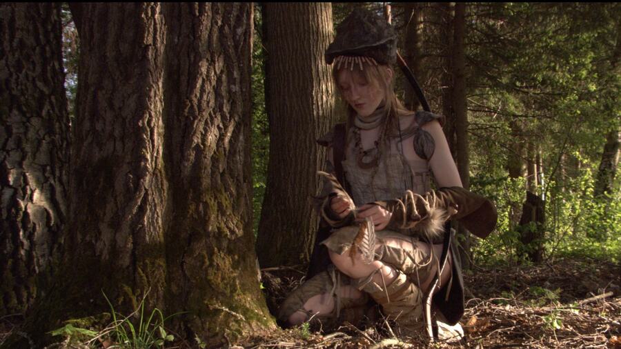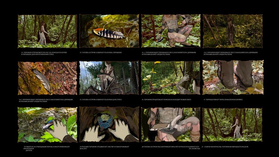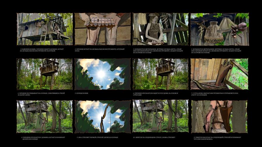 Завершается история Верхним миром. Голова — остров — мой авторский образ, вдохновленный фантастическими парящими островами, это божество Верхнего мира, на верхней части тела которого (голове) выросла целая скала. Это часть фильма носит название — Охота на солнце. Идея сценария родилась из древних образов финно-угорской мифологии, которые высекались на каменных и скальных культовых урочищах. Почти всегда это были композиции, включающие солярные и лунарные знаки, охотничьи ловушки, животных, которые вместе собирались в миф о небесной охоте. В этой истории верхнее божество-остров разыгрывает сцену охоты на солнце, как компиляцию духовных образов древних финно-угров. Персонаж ловит солнце в найденный артефакт- браслет, переносит его на мишень и пронзает стрелой.