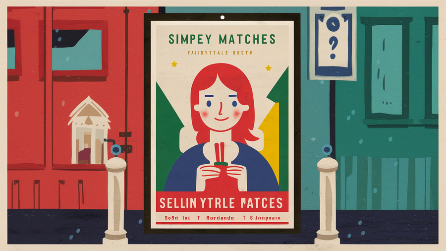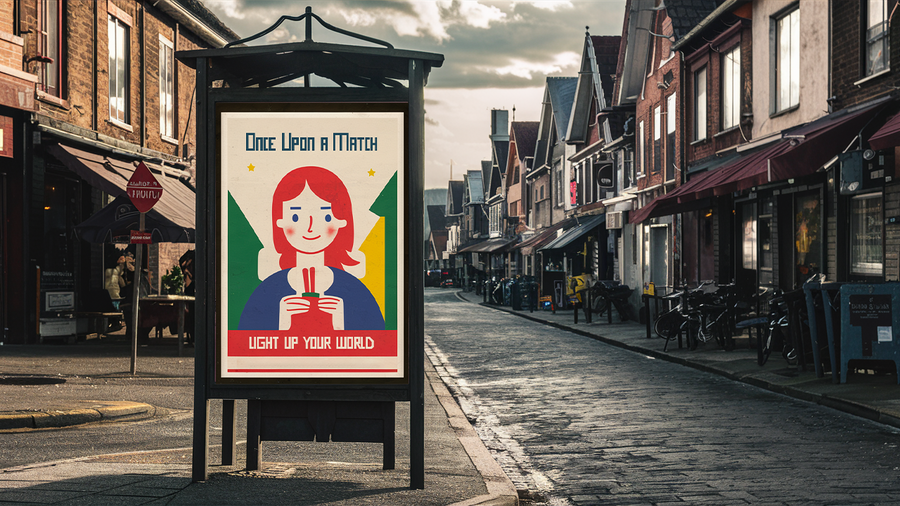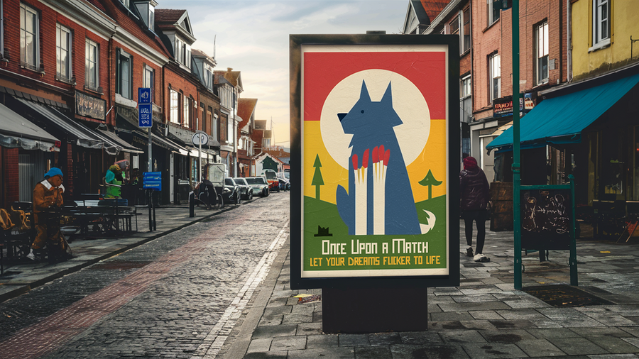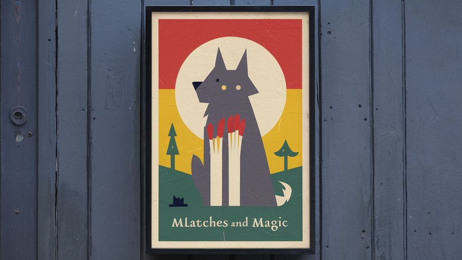 промпт плакатов (ideogram.ai): A street poster, simple and minimalistic illustration for a company selling matches. Fairytale and magic elements. Washed out colours, red, green, yellow and blue./ A street poster, simple and minimalistic illustration of a wolf with matches. Fairytale and magic elements. Washed out colours, red, green, yellow and blue.