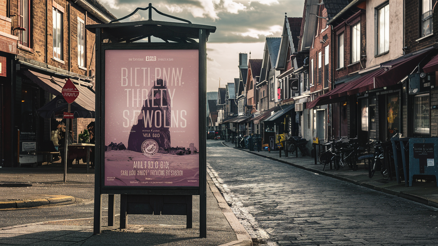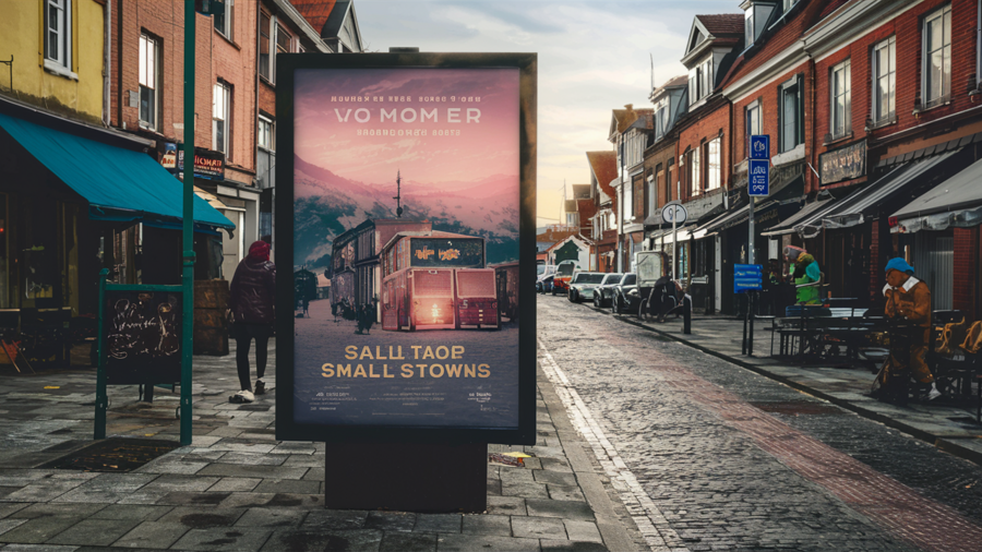 промпт банеров (ideogram.ai): A mockup for a poster 16:9 on the buisy street of a small town
