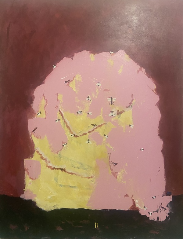 Работа «Торт как он есть» Часть III является частью триптиха «Размышления в одиночестве о стихии до возникновения земли» Часть I, «Муха» Часть II созданного в 2024 г. Холст на подрамнике, акрил. Размер 70×90