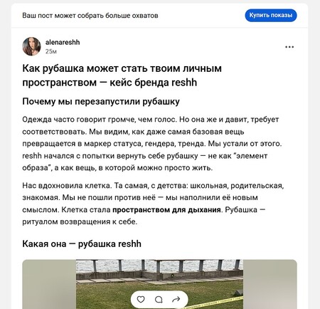 Создать рубрику «истории рубашек»: Мини-серии про людей, которые носят reshh, с личными цитатами и фото. Это даст и контент, и социальное доказательство.