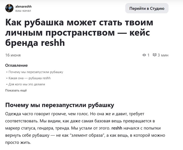 Я запустила продвижение проекта с нуля: оформила визуальный стиль, прописала ценности бренда, создала статью и видео, адаптировала тексты под SEO, опубликовала на нескольких платформах. Сделано всё, чтобы бренд reshh начал звучать в публичном поле — пусть пока и тихо.