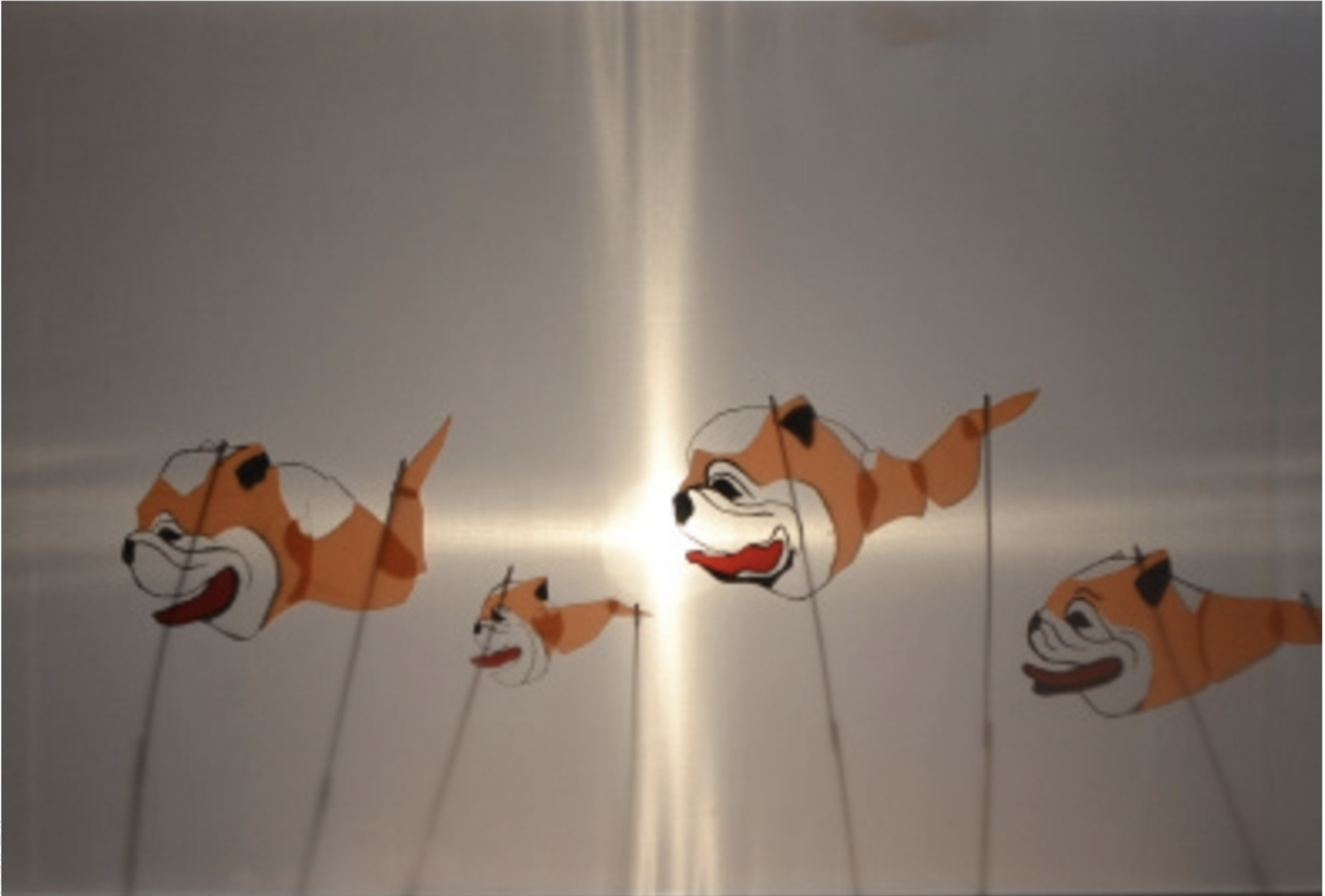 Мягкие игрушки повторяют героев спектакля, сохраняя сюрреалистическую эстетику театра теней. Например, игрушки в виде бульдогов с вытянутыми телами и яркими деталями или фигура человека с минималистичным силуэтом, в строгом костюме и цилиндре, словно балансирующая между абсурдом и элегантностью.