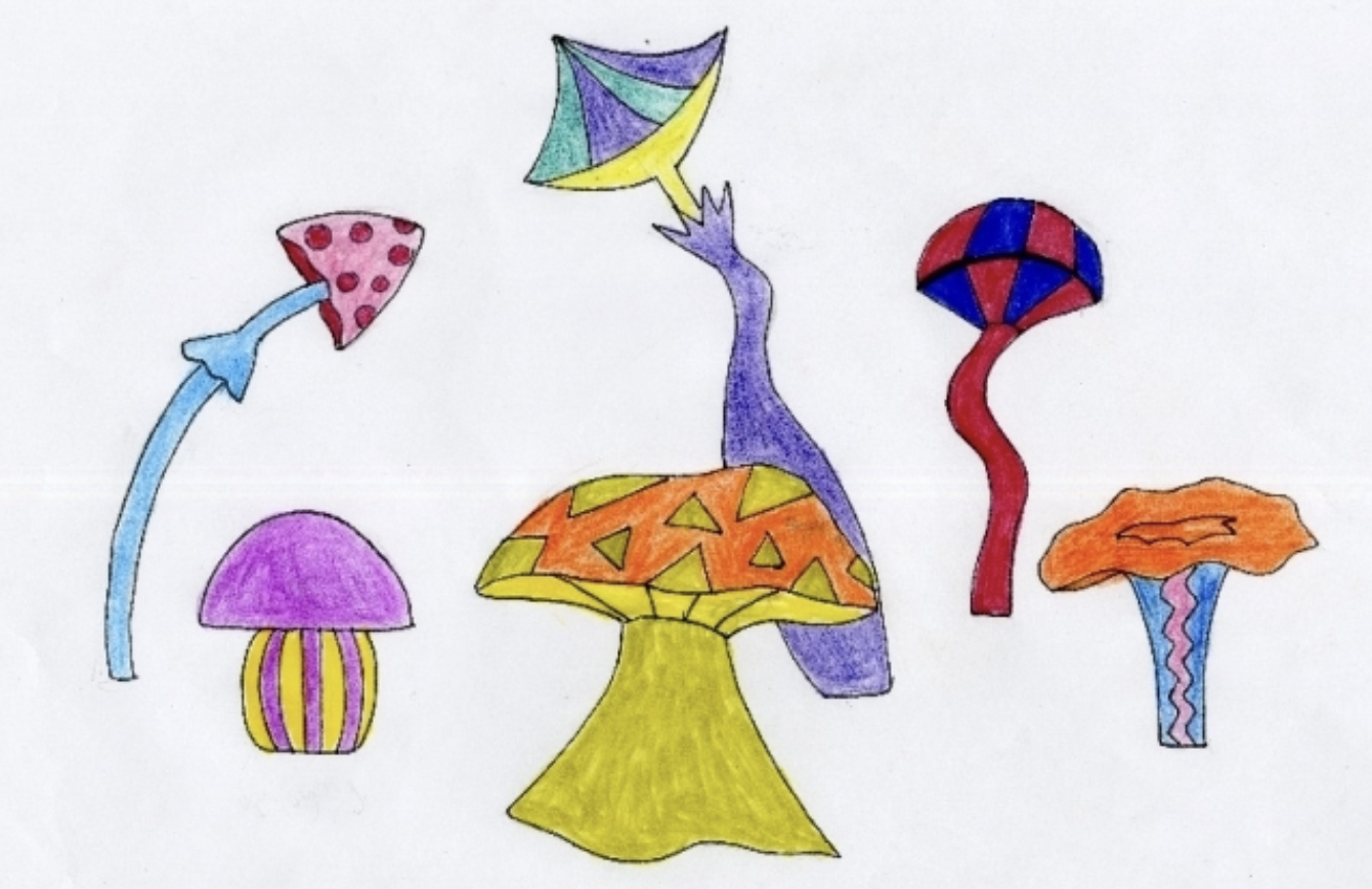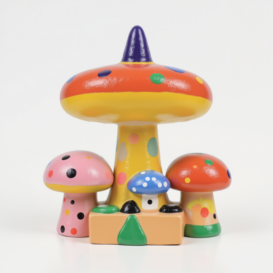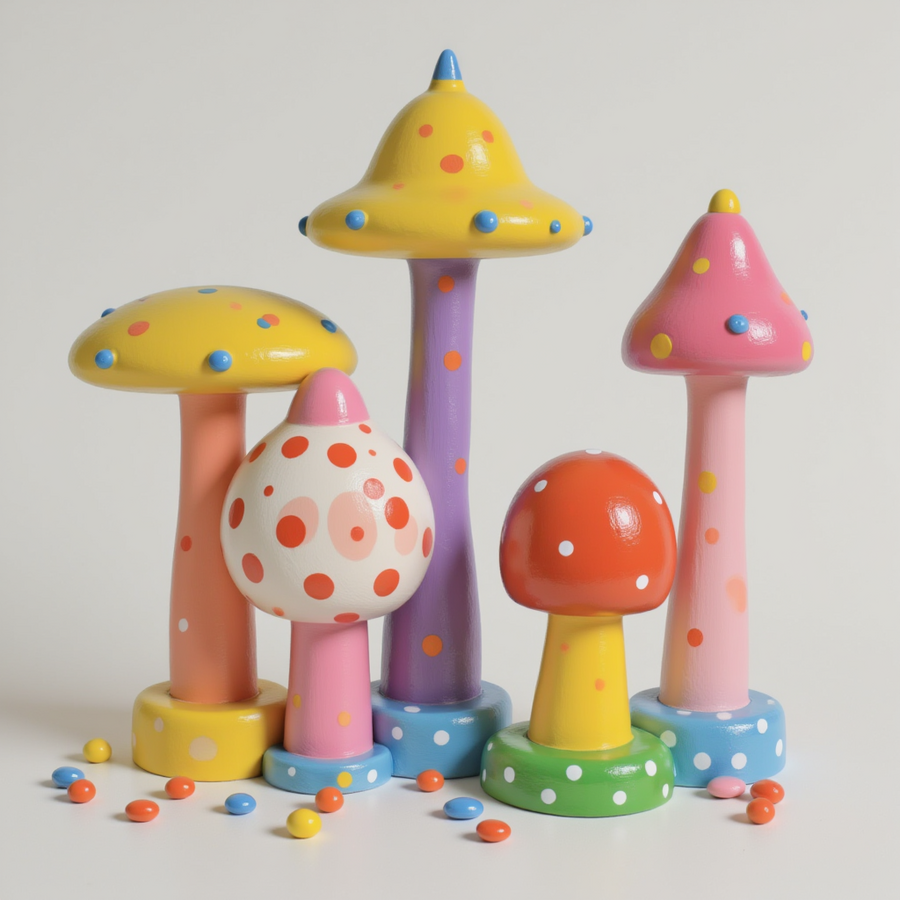 Промпт для генерации игрушек с помощью Krea ai: Souvenir mushroom toys, bright colorful, pink, yellow, orange, lime green, purple, red colors.