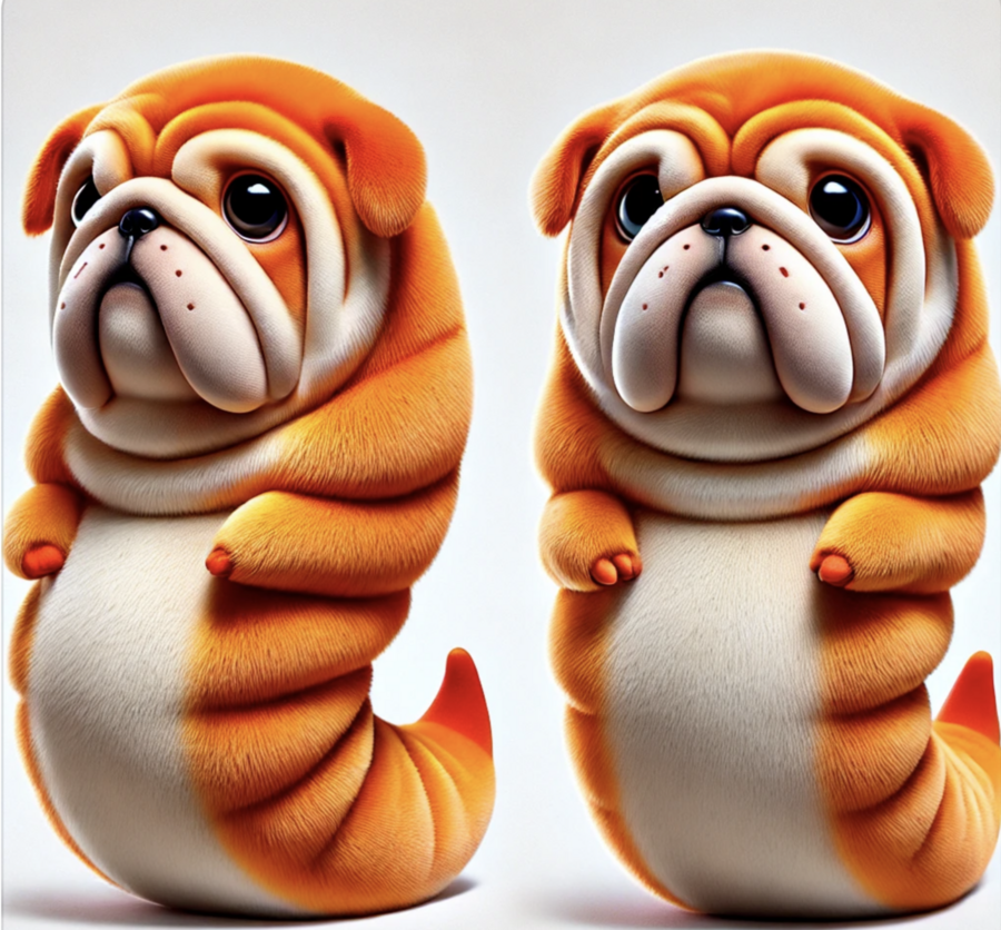 Формулирование промптов с помощью ChatGPT-4-turbo Промпт для генерации игрушек с помощью ChatGPT-4-turbo : Imagine a surreal adorable plush toy—a fusion of a bulldog and a leech. This fantastical creature has the smooth, elongated body shape of a leech, but it’s covered in soft, velvety fur that’s both fluffy and irresistibly huggable. Its face features the charming wrinkles and droopy expression of a bulldog, with big, round, soulful eyes that make it look both lovable and slightly comical.