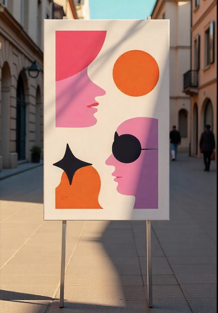 Realistic Outdoor mokeup posters win bright colorful, minimalistic surrealistic, inspired by shadow puppet theater, simple clear shapes pink, violet, black, orang colors.