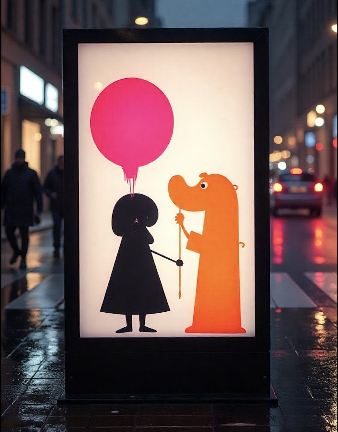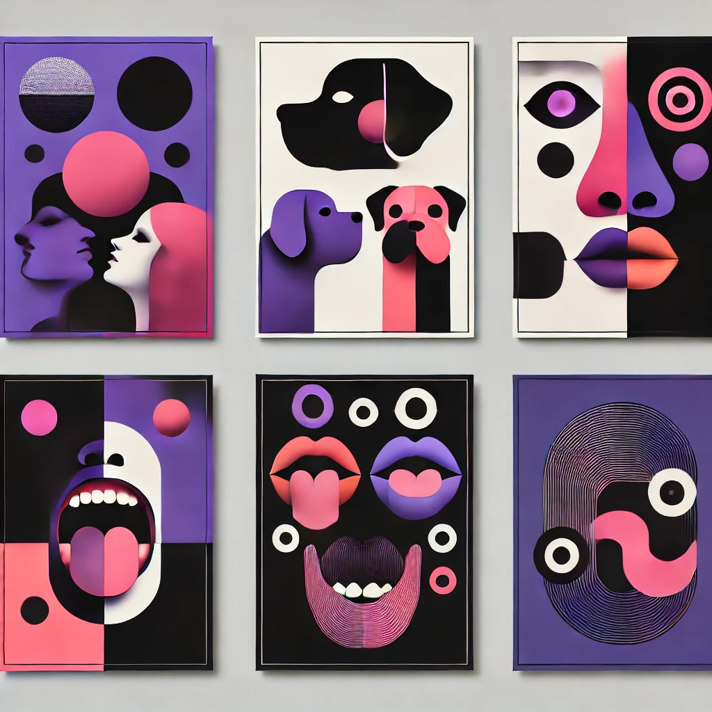 Промпты постеров сделанных с помощью DALL-E 3, FreePik: Minimalistic surreal advertising posters inspired by aggressive shadow puppet aesthetics, clear bold shapes, simple typography, monochromatic pink-black-white palette, flat design style.