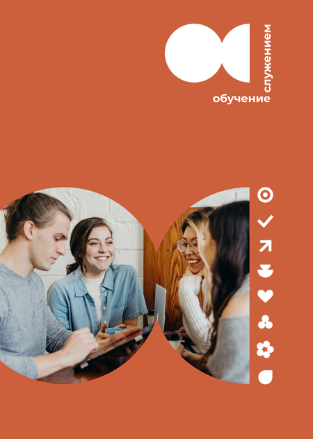 Главная метафора айдентики для государственной программы Обучение служением — взаимодействие, помощь и тесные горизонтальные связи. Каждая пиктограмма вместе с логотипом олицетворяет один из аспектов благотворительной программы, главные цели которой — поддержка нуждающихся и объединение общества. Именно поэтому все элементы пиктограмм связаны друг с другом, визуально поддерживают друг друга.