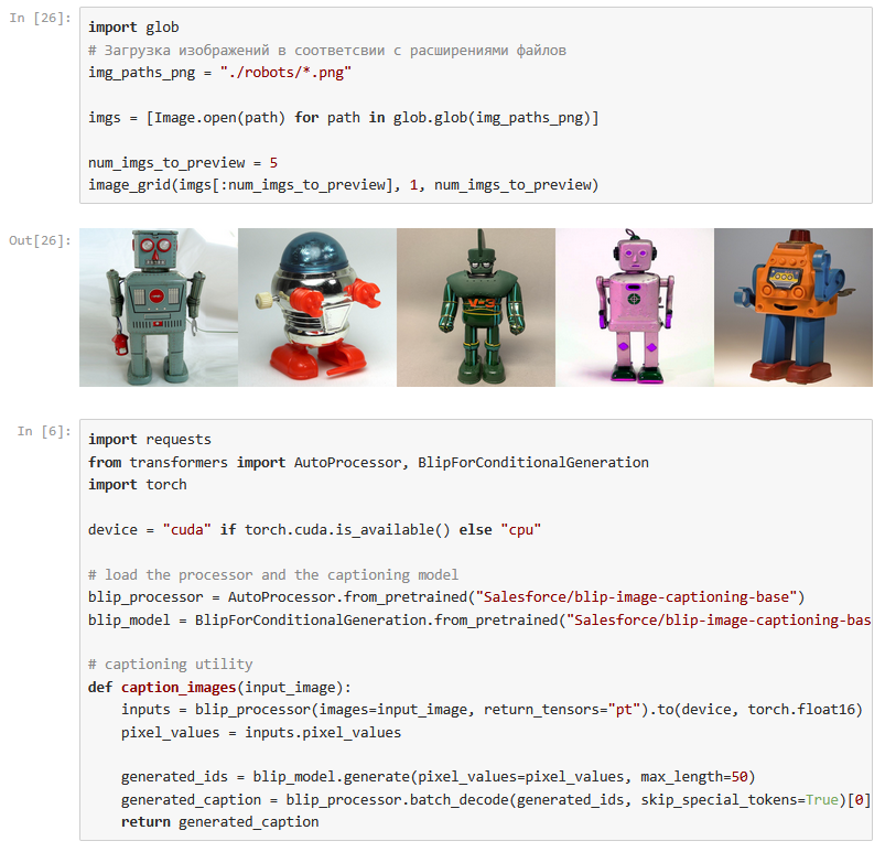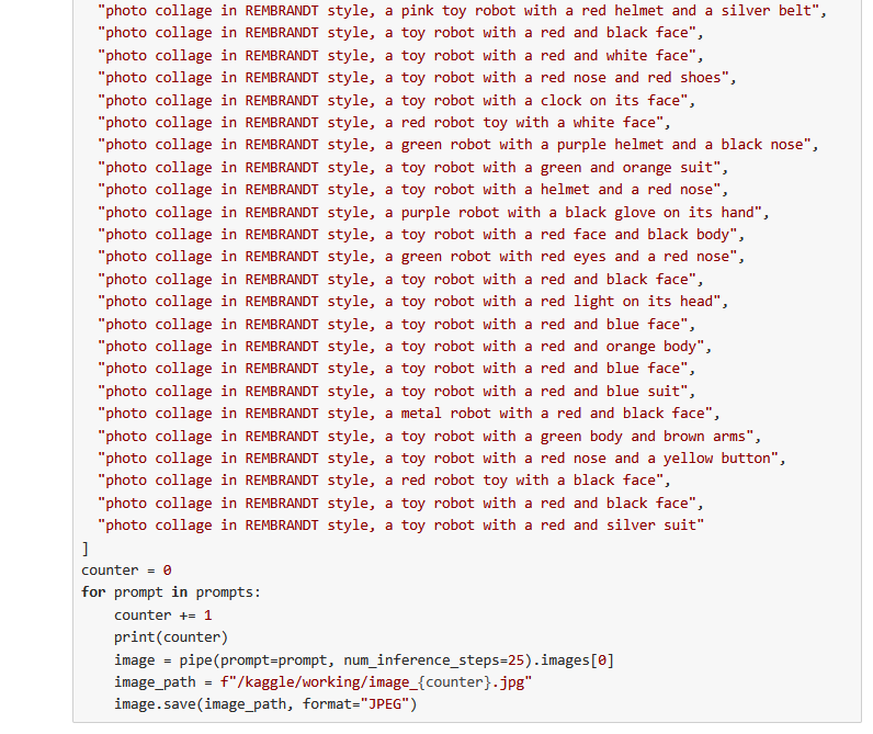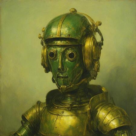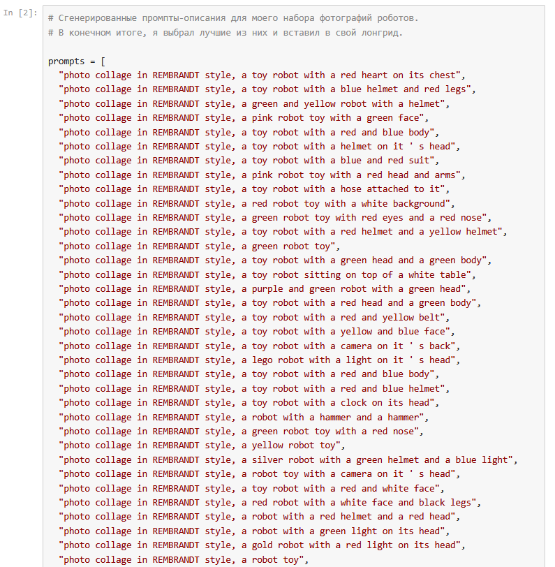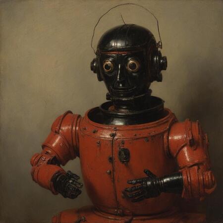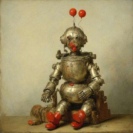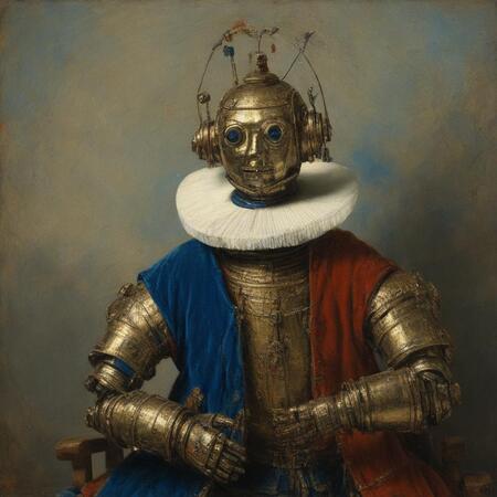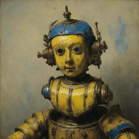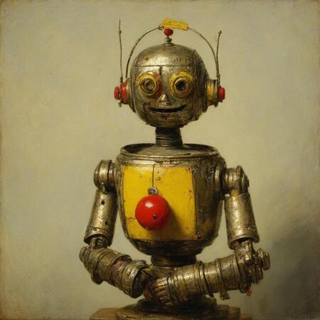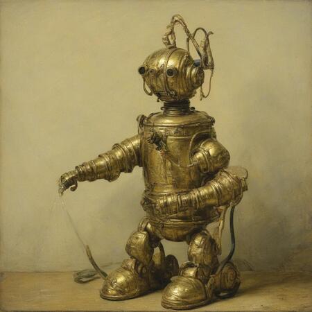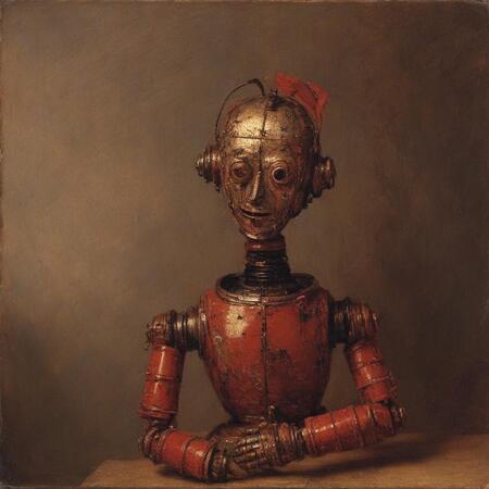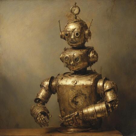 Исходные изображения это 26 портретов голландского художника Рембрандта ван Рейна а также картинки со старыми игрушечными роботами, из которых я извлёк промпты для генерации.