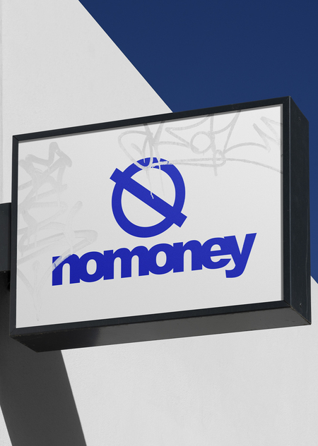 the logo with the name «nomoney» is white on a completely blue background. The font is simple, strict and stylish