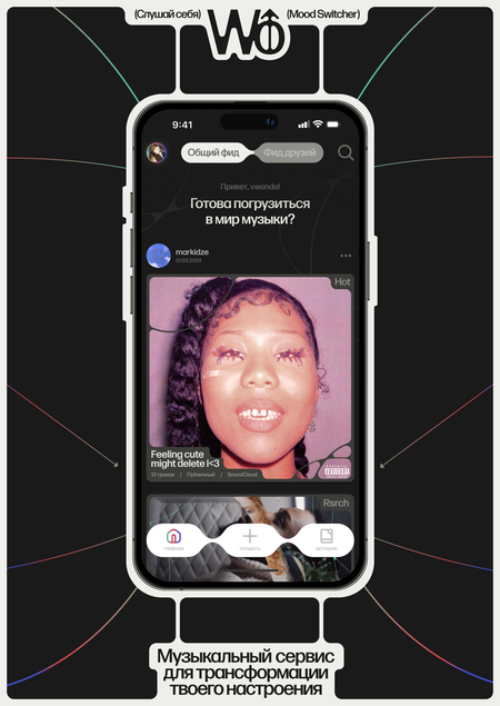 Wō — музыкальный сервис для трансформации настроения. Wō анализирует текущее настроение пользователя и предлагает персональные плейлисты, способствующие эмоциональной регуляции.