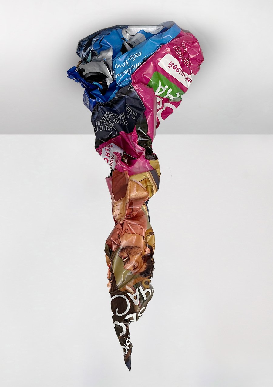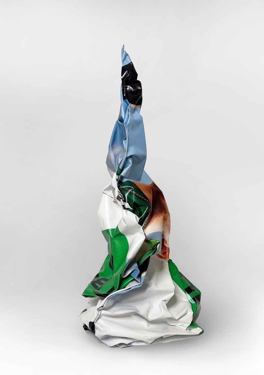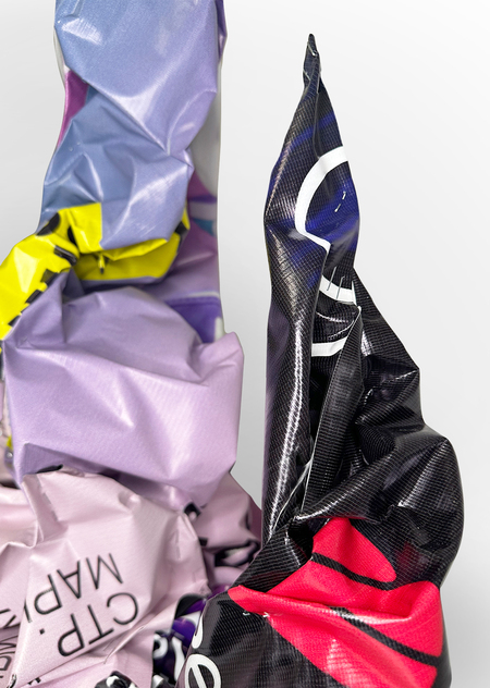 Из потолка и пола, словно сталактиты и сталагмиты, «вырастают» объекты, созданные из баннеров. Эти «кристаллы» — застывшие фрагменты информации, запечатлевшие мгновение перед тем, как визуальный «мусор» поглотит все вокруг, прорываясь сквозь границы здания.