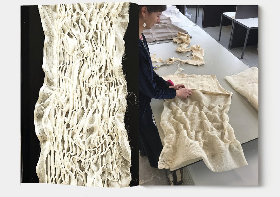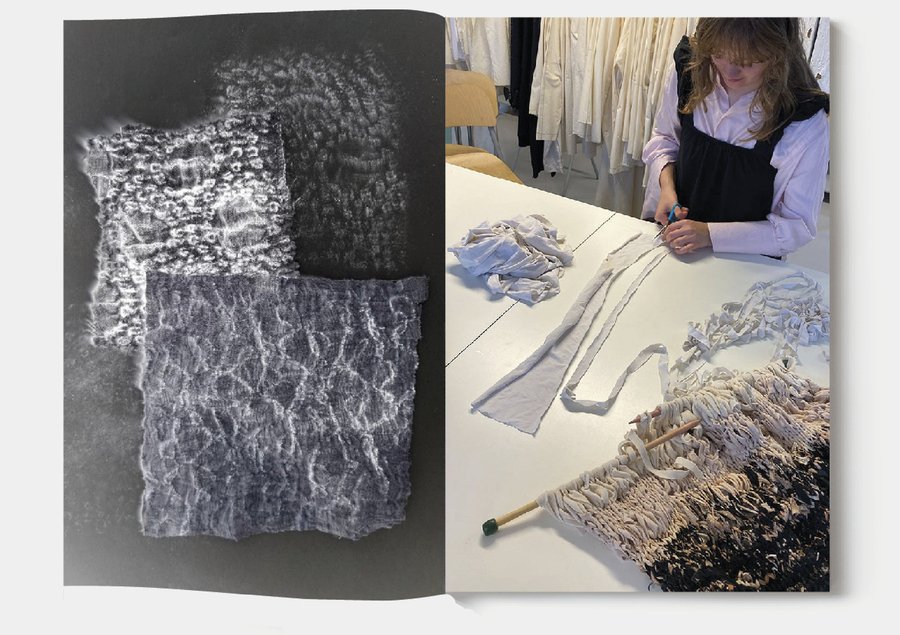 a business card for the workshop that helps designers and local brands find new forms in clothing using non-standard, transformed material. In the workshop, existing material is transformed using prin