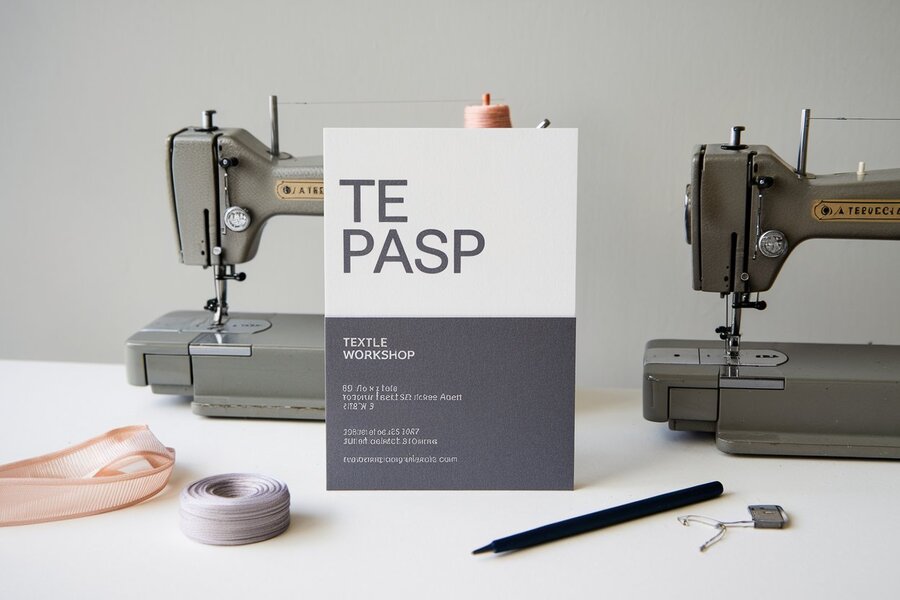 Invitation cards in A5 size with a minimalist corporate style for a textile workshop with the te PASP logo, use dirty grey, dark gray and white, minimalist Helvetica font