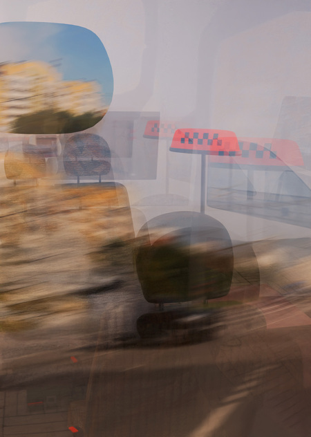 Таксисты собирают город по частям — по фрагментам, но никогда не обладают им целиком. Поэтому, создавая эту инсталляцию, я попросила своего отца — водителя такси — фотографировать зеркала и виды из машины во время его поездок. Эти снимки становятся фрагментами реальности, случайными точками на маршруте, в которых он оказывается в течение рабочего дня. Я завешиваю ими пространство вокруг собранной мной «домашней» сцены, чтобы зритель оказывался внутри этой истории перемещения.