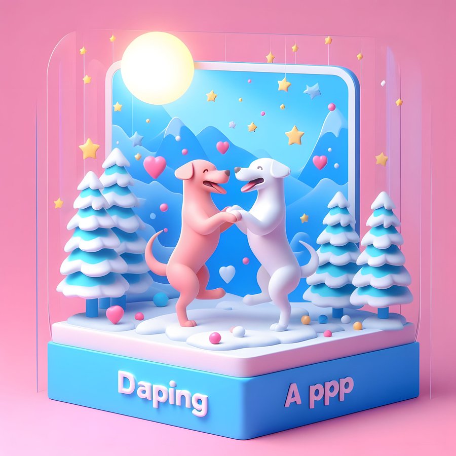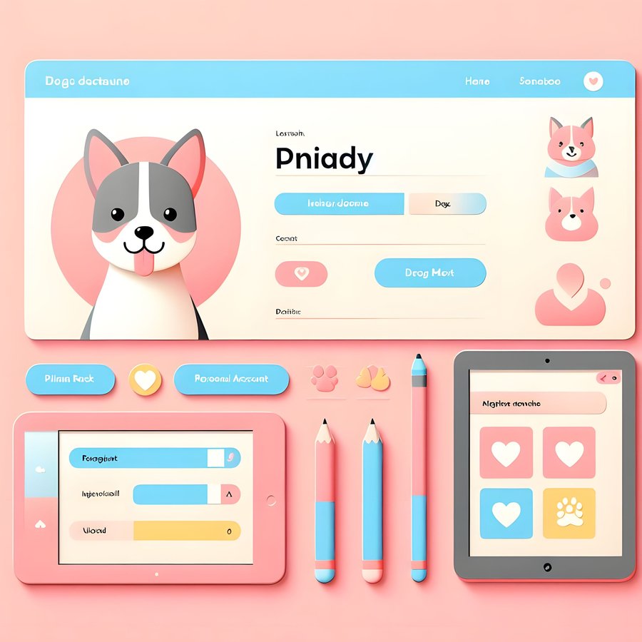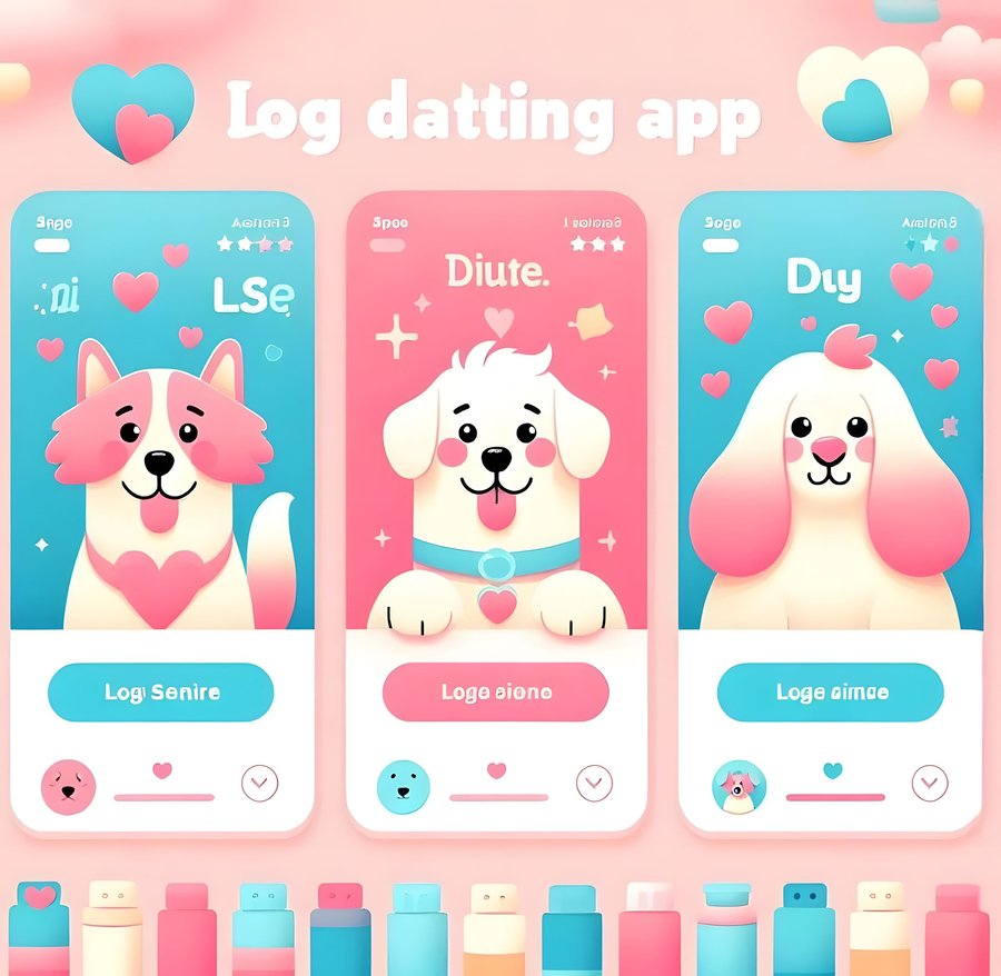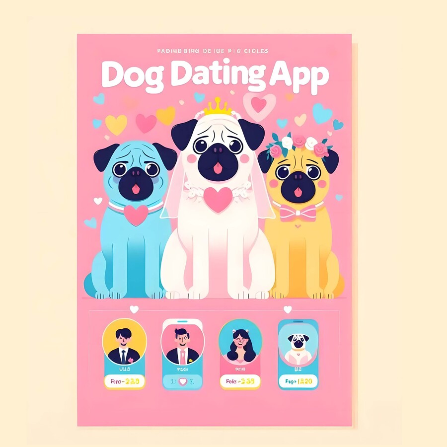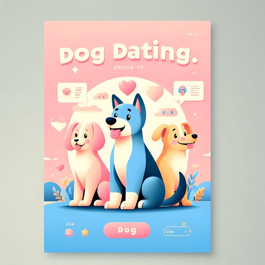1. dogs using the dog’s dating app, pastel colours: pink, blue and yellow, realistic photo.