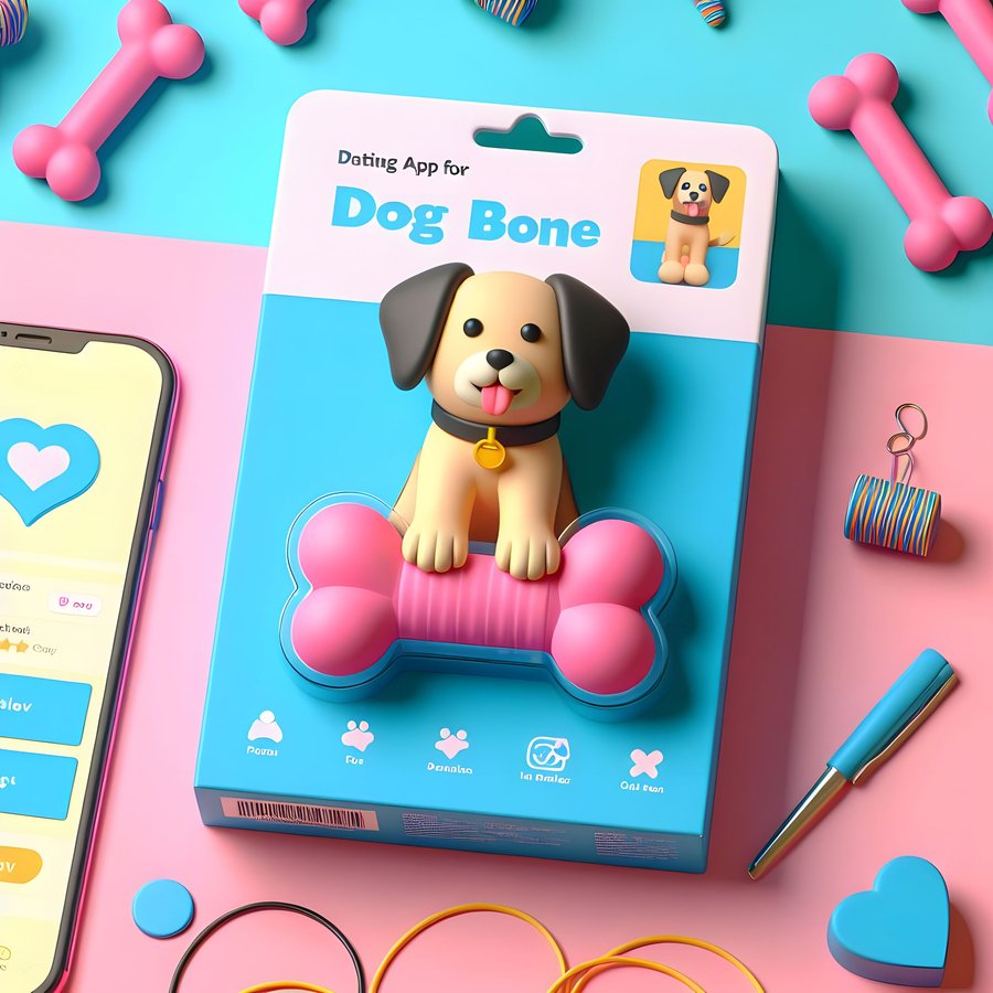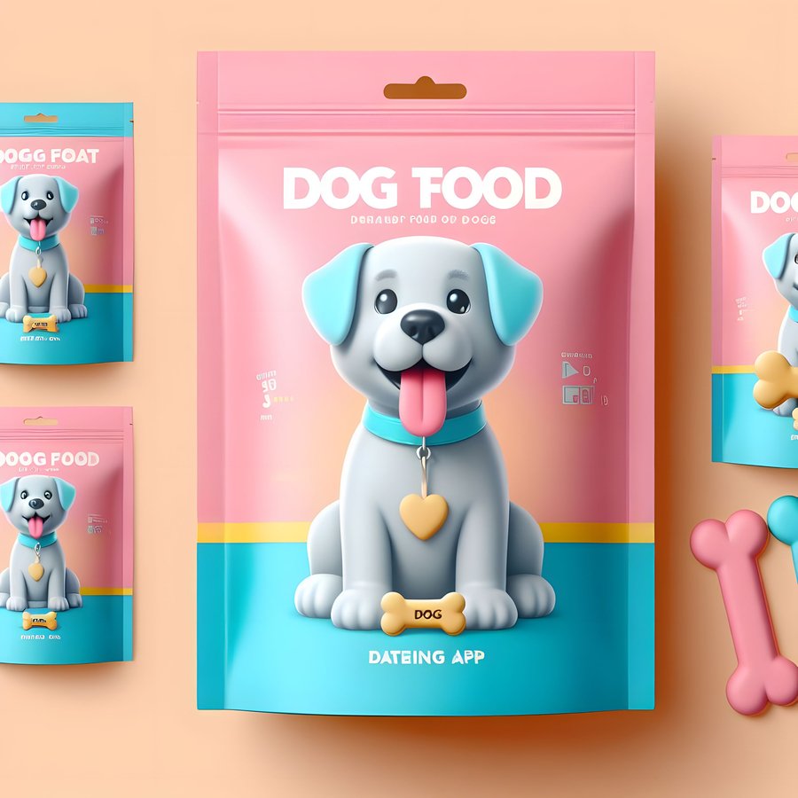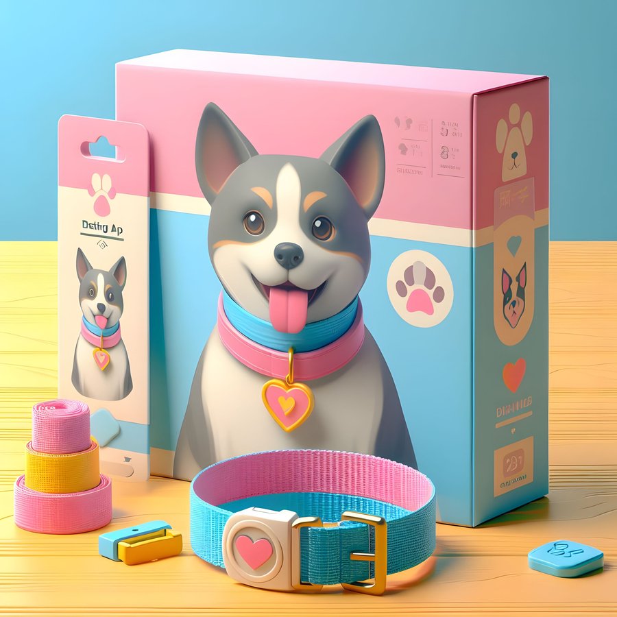 1. art of dog on the toy bone package, a mockup of a dog toy, merch of the dating app for dogs, pastel colours: pink, blue and yellow. 2. art of dog on the dog food package, a mockup of a dog food. merch of the dating app for dogs, pastel colours: pink, blue and yellow. 3. art of dog on the collar package, a mockup of a collar, merch of the dating app for dogs, pastel colours: pink, blue and yellow.