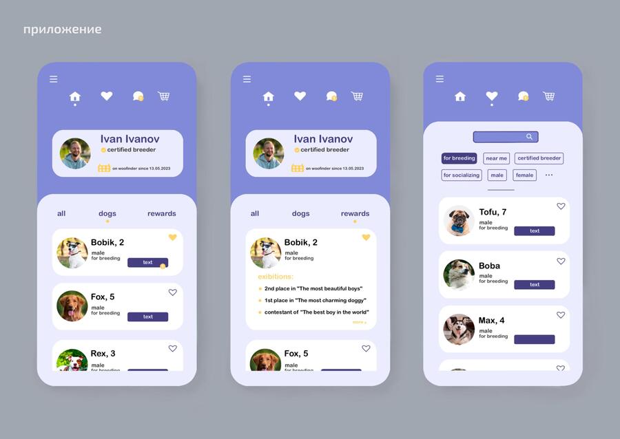 Приложение для онлайн-знакомств собак, в котором можно найти идеальную пару своему питомцу для разведения или общения, а так же познакомиться с другими собачниками.
