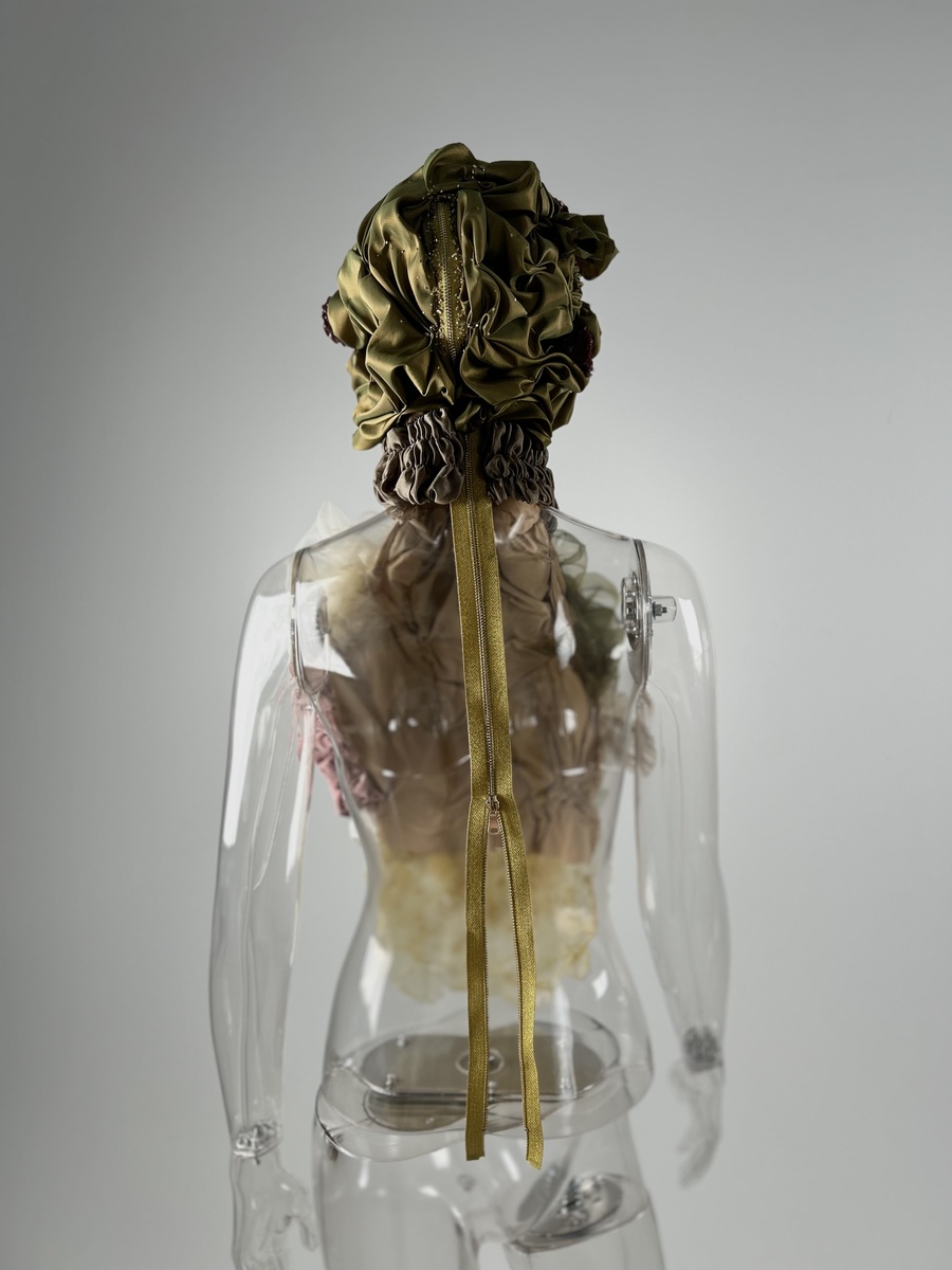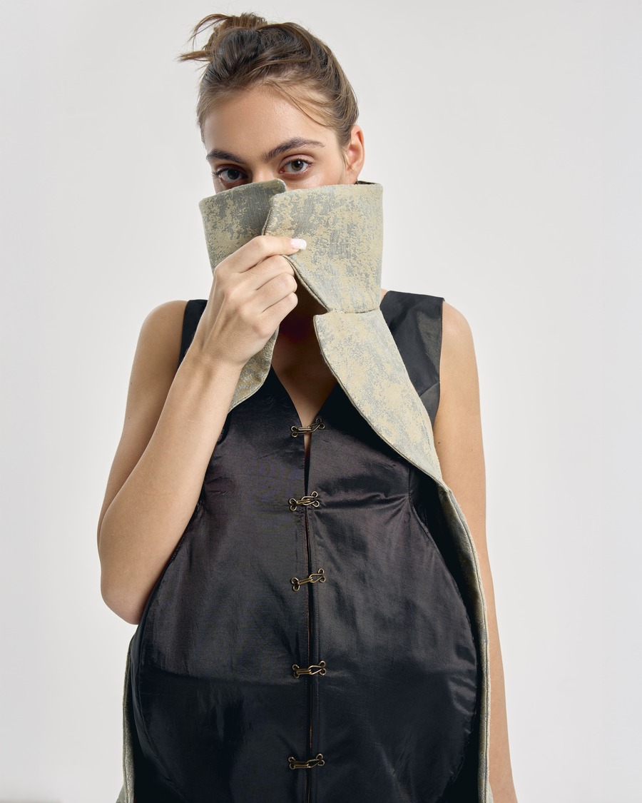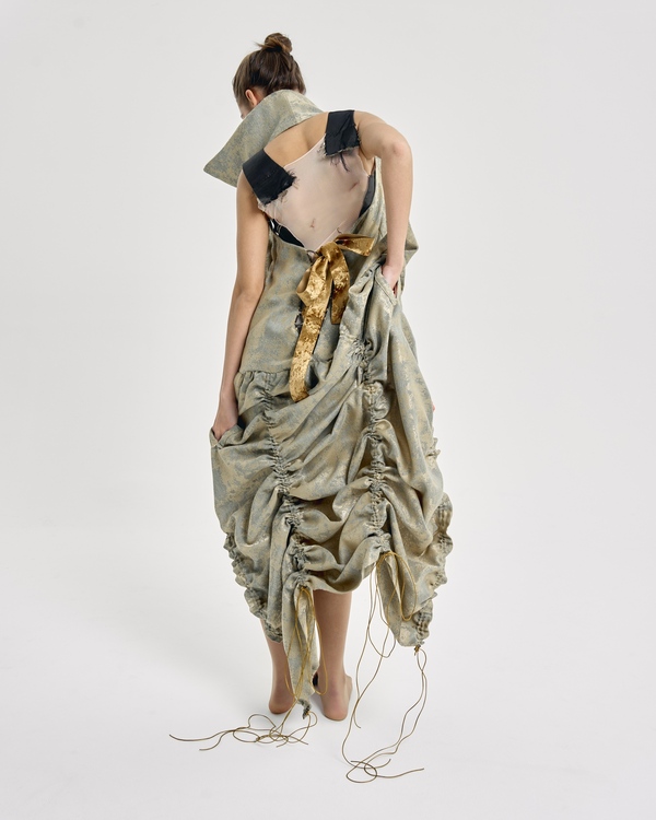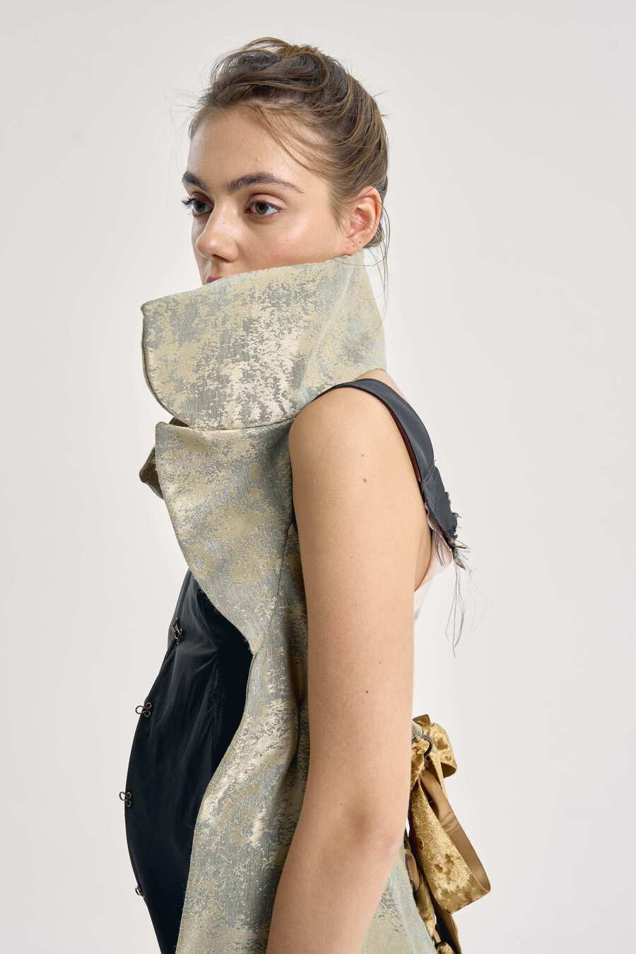 Изделие парадно — но золото будто тронуто патиной, как памятью о тлении. Жилет надут и не застёгивается, словно живот, распираемый излишеством; карманы вывернуты от перенаполненности — следы жадности, которые уже не скрыть. Низ юбки стягивается и напоминает театральную занавеску — вот-вот начнётся представление… Комедия или трагедия?