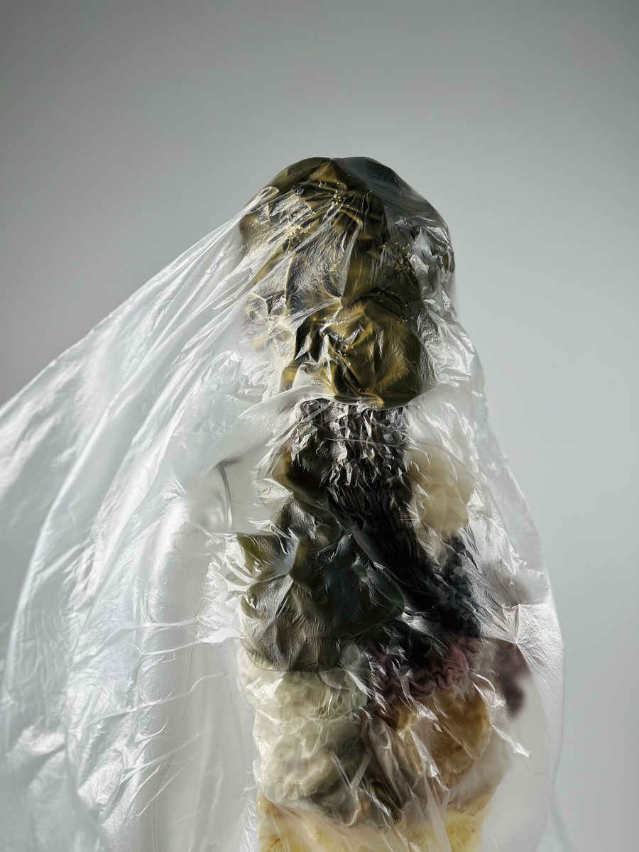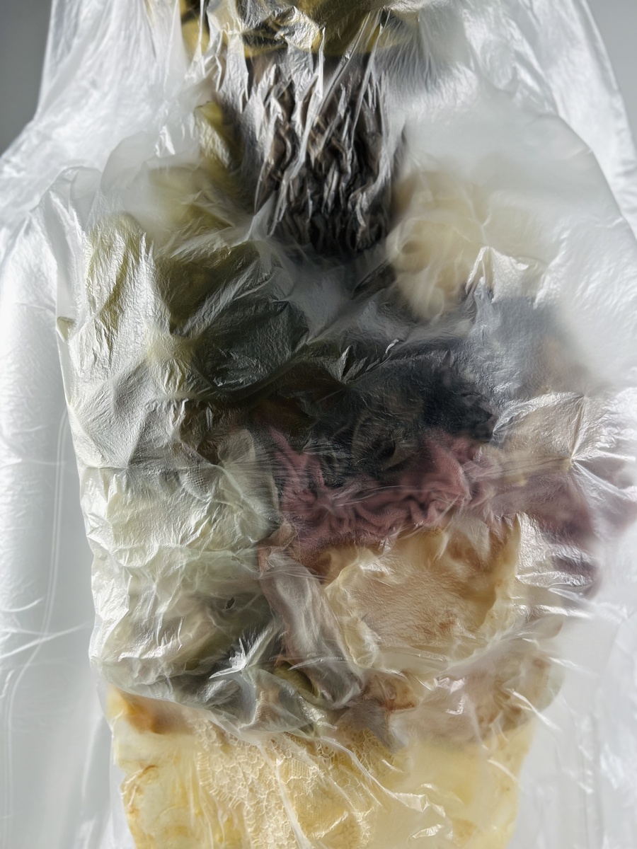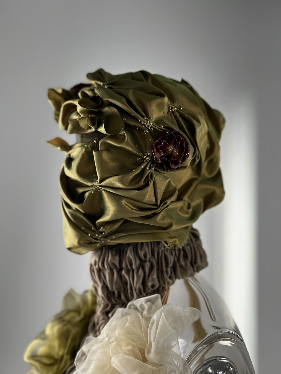 Изделие парадно — но золото будто тронуто патиной, как памятью о тлении. Жилет надут и не застёгивается, словно живот, распираемый излишеством; карманы вывернуты от перенаполненности — следы жадности, которые уже не скрыть. Низ юбки стягивается и напоминает театральную занавеску — вот-вот начнётся представление… Комедия или трагедия?