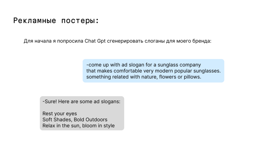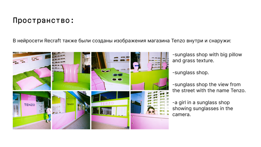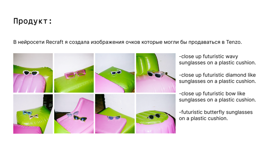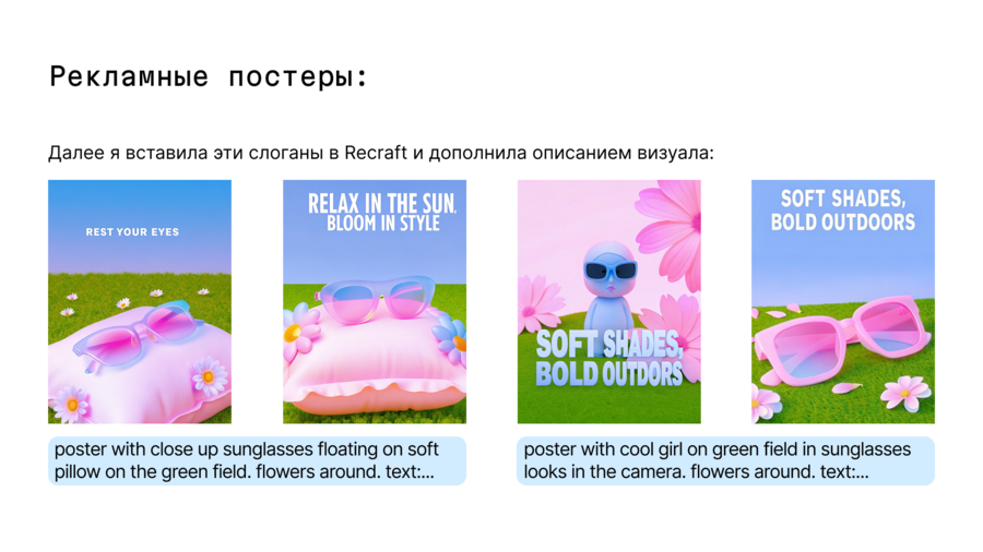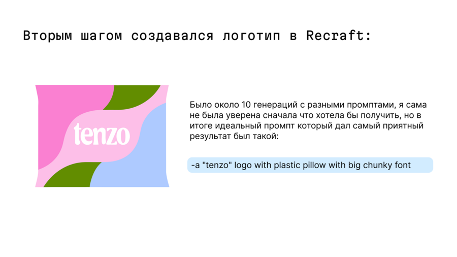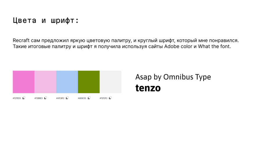 В качестве инструментов для выполнения проекта были использованы только 2 нейросети: Chat GPT для текстовых составляющих, и Recraft для всех изображений. Нейросети Recraft с её широким спектром функций и высоким качеством генерации изображений мне более чем хватило, чтобы сгенерировать все составляющие проекта. Я активно пользовалась функцией выбора стиля (hard light, translucent gossamer) и фиксации цветовой палитры. А также функцией image set, компиляции текста с изображением и генераций на основе уже сделанных изображений.
