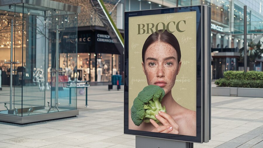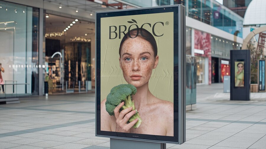 Promt: A photo of a mock-up of an advertising poster with cosmetics on the street. The light beige poster has the olive name «BROCC» and depicts a woman with freckles. She has broccoli in her hand. The background contains shopping malls.
